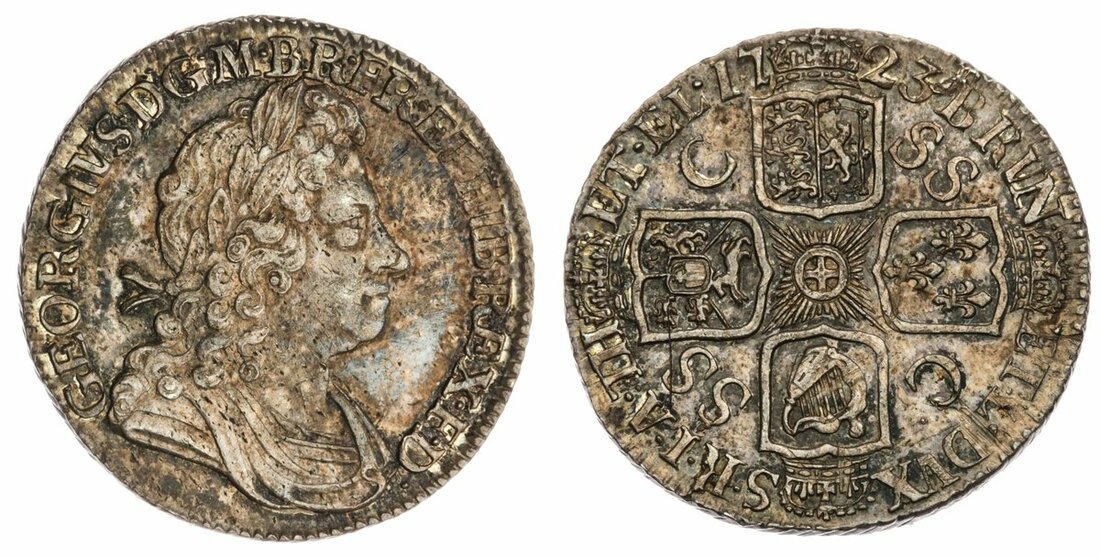 George I (1714-1727), South Sea Company, Shilling, 1723, first bust, rev. C over SS in fourth quarter, seven strings, edge obliquely milled, 5.96g, 5h (Bull 1590; ESC 1176A; Spink 3647), traces of adjustment to periphery, otherwise lightly toned over lustrous and quite brilliant surfaces, an excellent example even for this commonly encountered issued, extremely fine, the variety rare in this condition