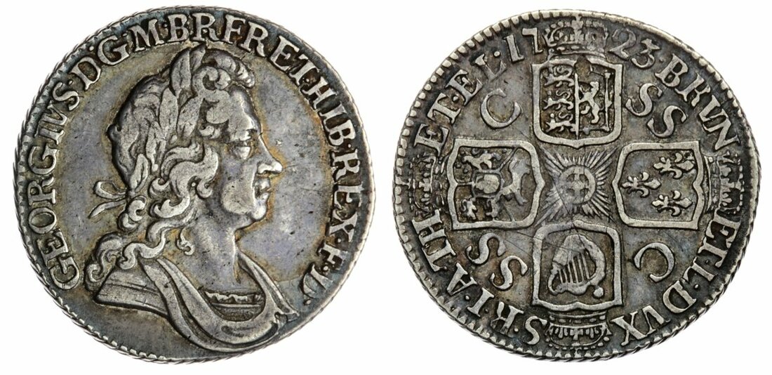 The L'Abbaye Collection | George I (1714-1727), 'South Sea Company' Shilling, 1723, second bust, rev. six strings to harp, roses and plumes in angles, edge obliquely milled, 5.91g, 6h (Bull 1591 ~ albeit six strings not recorded; ESC 1178; Pywell-Phillips - [cf. 275]; Spink 3648), toned, almost very fine