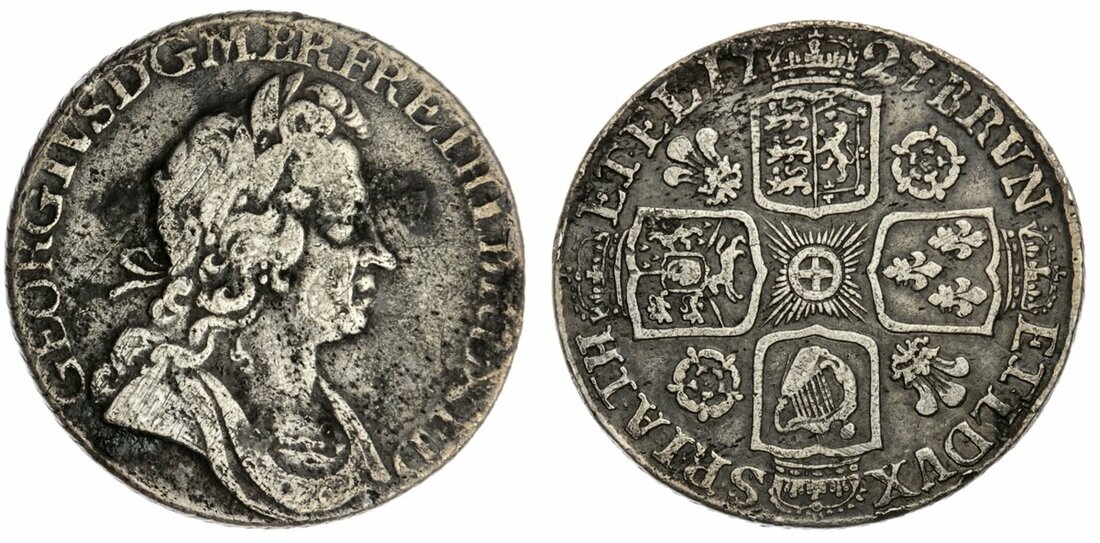 The L'Abbaye Collection | George I (1714-1727), 'Roses and Plumes' Shilling, 1727, second bust, no stops on obverse, rev. seven strings to harp, roses and plumes in angles, edge obliquely milled, 5.77g, 5h (Bull 1607 [R5]; ESC 1188A; Pywell-Phillips 279; Spink 3649), flecked, porous and with surface marks, otherwise a clear type coin of this extremely elusive date, only a strict fine / good fine for strike, but excessively rare