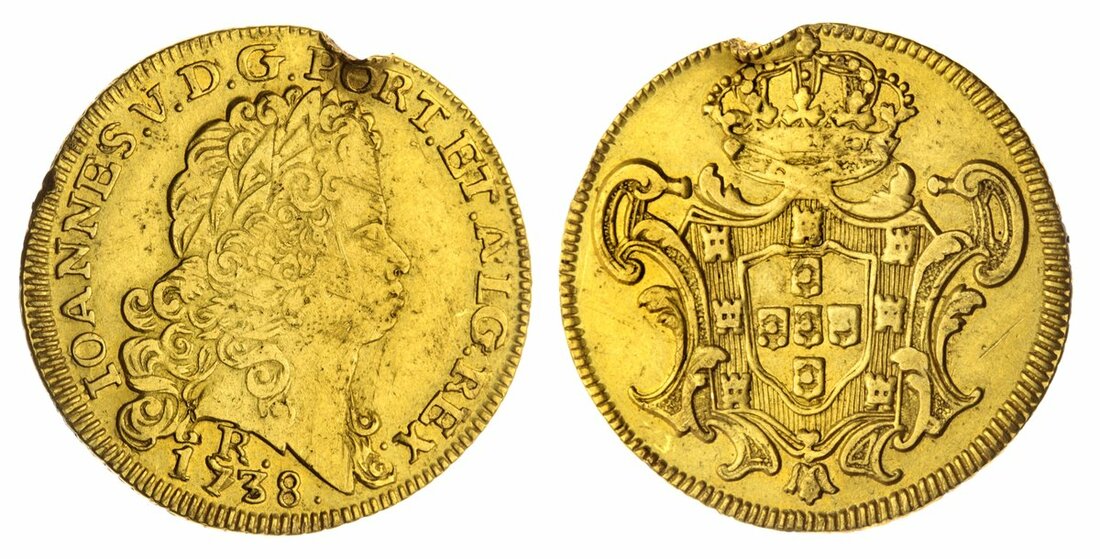 Foreign Gold Coinage in Britain | The 'Half-Joannes' of 36-Shillings | Brazil, João V (1706-1750), 4-Escudos [6,400-Reis], 1738-R, Rio, laureate head right, rev. crowned and garnished shield, edge milled, 14.10g, 12h (Fb. 46; KM 149), significant distortion to edge at 12 o'clock where clunked by a plough and with light superficial marks consistent with soil deposition, otherwise very fine, and a rare discovery from a secure British context