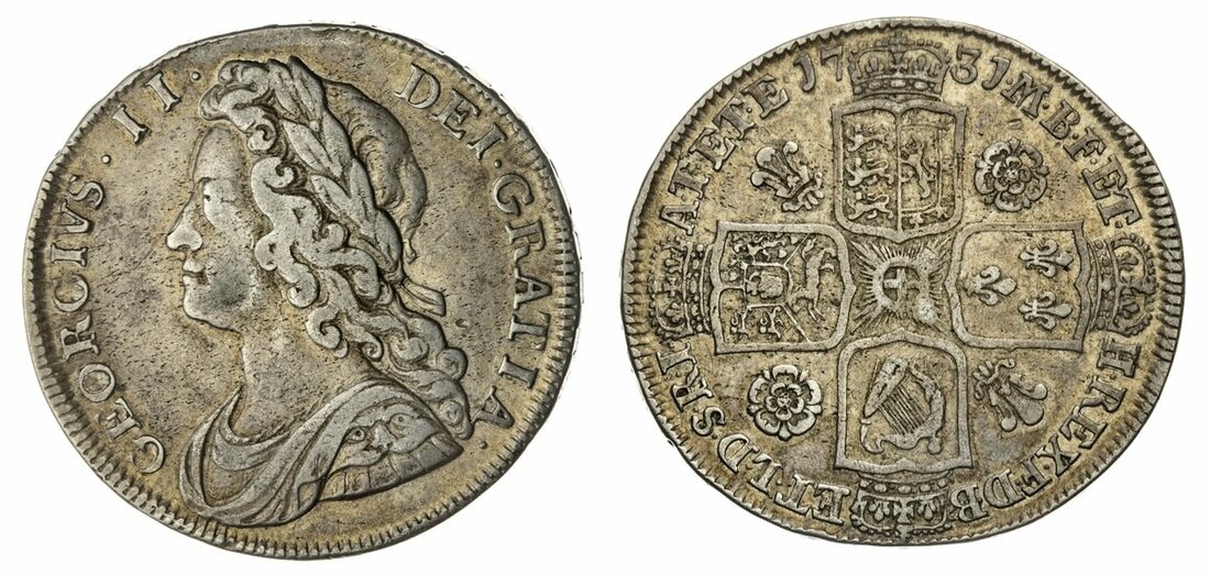 George II (1727-1760), 'Roses and Plumes' Halfcrown, 1731 QVINTO, ten strings to harp, edge lettered downwards, 14.84g, 7h (Bull 1674; ESC 595; Pywell-Phillips 316; Spink 3692), cleaned, otherwise a bold fine