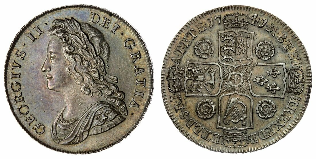 George II (1727-1760), Halfcrown, 1741 over 39 DECIMO QVARTO, young laureate, draped and cuirassed bust left, rev. crowned shields cruciform, seven strings to harp, 15.07g, 7h (Bull 1682; ESC 601A; Adams 545; Spink 3693), a truly sublime example with only the faintest trace of die wear to highest points and a small die break through O of GEORGIVS, otherwise delightfully toned and handsomely balanced, much as struck, rare thus