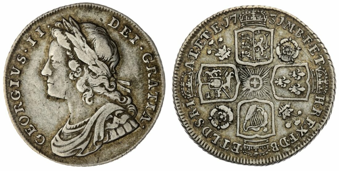The L'Abbaye Collection | George II (1727-1760), 'Roses and Plumes' Shilling, 1731, young head, small lettering, rev. T over E in A T ET E, six strings to harp, roses and plumes in angles, edge obliquely milled, 5.99g, 6h (Bull 1704; ESC 1194; Pywell-Phillips - [cf. 332]; Spink 3698), the die sinker's error clear, lightly toned, good fine and very rare