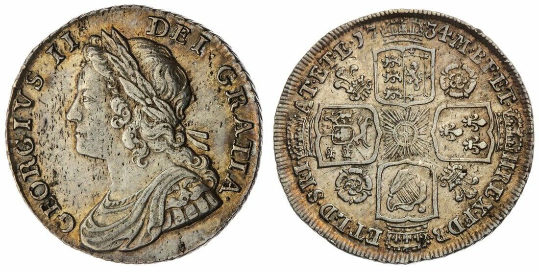 The L'Abbaye Collection | George II (1727-1760), 'Roses and Plumes' Shilling, 1734, young head, large lettering, no extra stop before DEI, rev. nine strings to harp, roses and plumes in angles, edge obliquely milled, 6.01g, 6h (Bull 1706; ESC 1197; Pywell-Phillips 334; Spink 3700), flecking before nose and adjustment through Irish harp, otherwise with peripheral golden toning, good very fine
