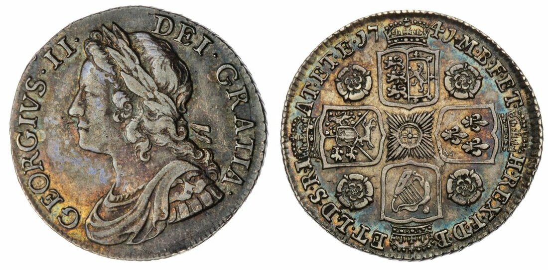 The L'Abbaye Collection | George II (1727-1760), 'Roses' Shilling, 1741, young head, large lettering, rev. smaller Garter star, seven strings to harp, roses in angles, edge obliquely milled, 6.00g, 6h (Bull 1717; ESC 1202; Pywell-Phillips 339; Spink 3701), handsomely toned, a pleasing very fine