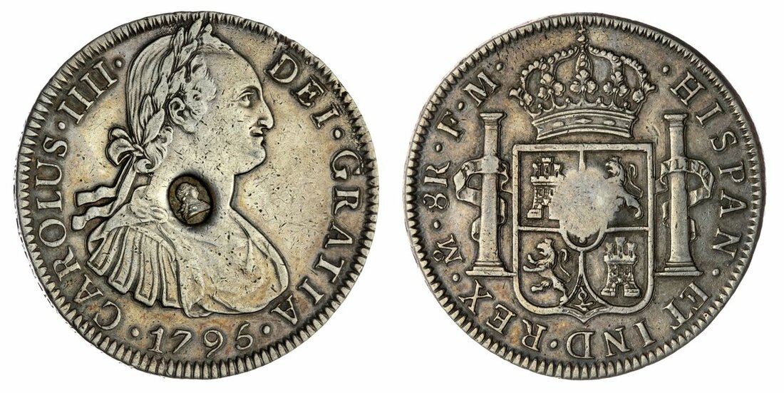 George III (1760-1820), Emergency Issues (1797-1799), Oval-Countermark Dollar (8-Reales), 1795-FM, Mexico City, laureate and draped bust right, oval countermark of George III in centre, rev. crowned square-topped shield dividing pillars, security edge, 26.81g, 11h (Bull 1852; ESC 129; Spink 3765A), cleaned, the host coin about very fine, the countermark good very fine