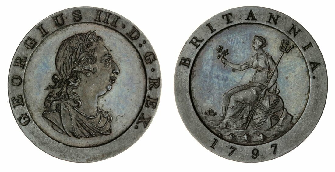 The Abramson Collection of English Coins | George III (1760-1820), Pattern 'Cartwheel' Farthing, 1797, by C H Küchler, laureate and draped bust right, rev. Britannia seated left, holding palm and trident edge plain, 6.96g, 6h (BMC [Peck] 1199), attractively lustrous bronzed surfaces, good extremely fine, scarce