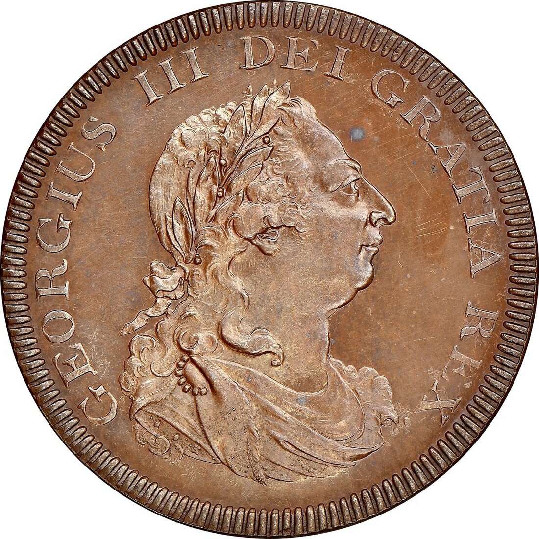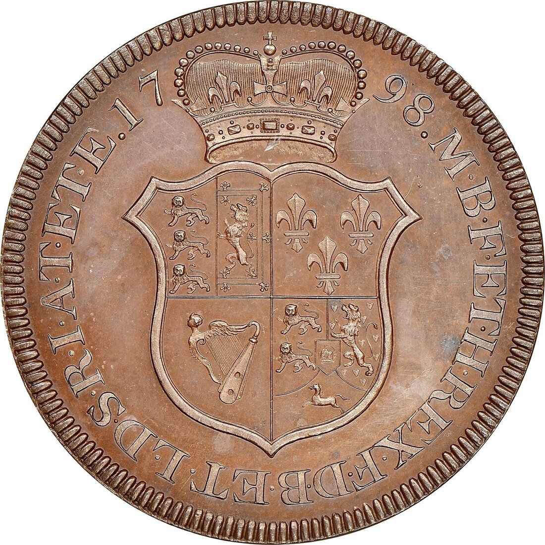 PF64 BN | George III (1760-1820), Pattern Dollar, 1798, in copper, by C H Küchler, first leaf to upright of E in DEI, laureate and draped bust right, • • K on truncation, rev. crowned 'Spade' shield, edge plain, 23.93g, 12h (Pywell-Phillips -; cf. L&S 37; cf. Davis 5; Bull A³/1, type G/1; ESC 1913 [175A] [R6]), a delightful specimen with wonderful mahogany patination across brilliant surfaces, practically as struck, perhaps even the finest known of this extremely rare variety from a most handsome series, in NGC holder, graded PF64 BN (Cert. #5878624-001)