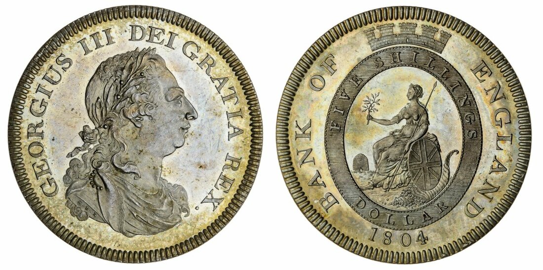 George III, Bank of England, Proof Dollar, 1804, in silver, laureate, draped and cuirassed bust right, C . H . K on truncation, leaf to end of E, rev. Britannia seated, inverted K in relief [above inverted incuse K] below shield, edge plain, 26.84g, 12h (Bull 1946; ESC 160; Spink 3768), some haziness to peripheries, otherwise brilliant with handsome cameo definition to portraiture, good extremely fine, very rare