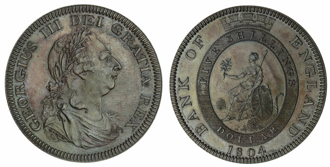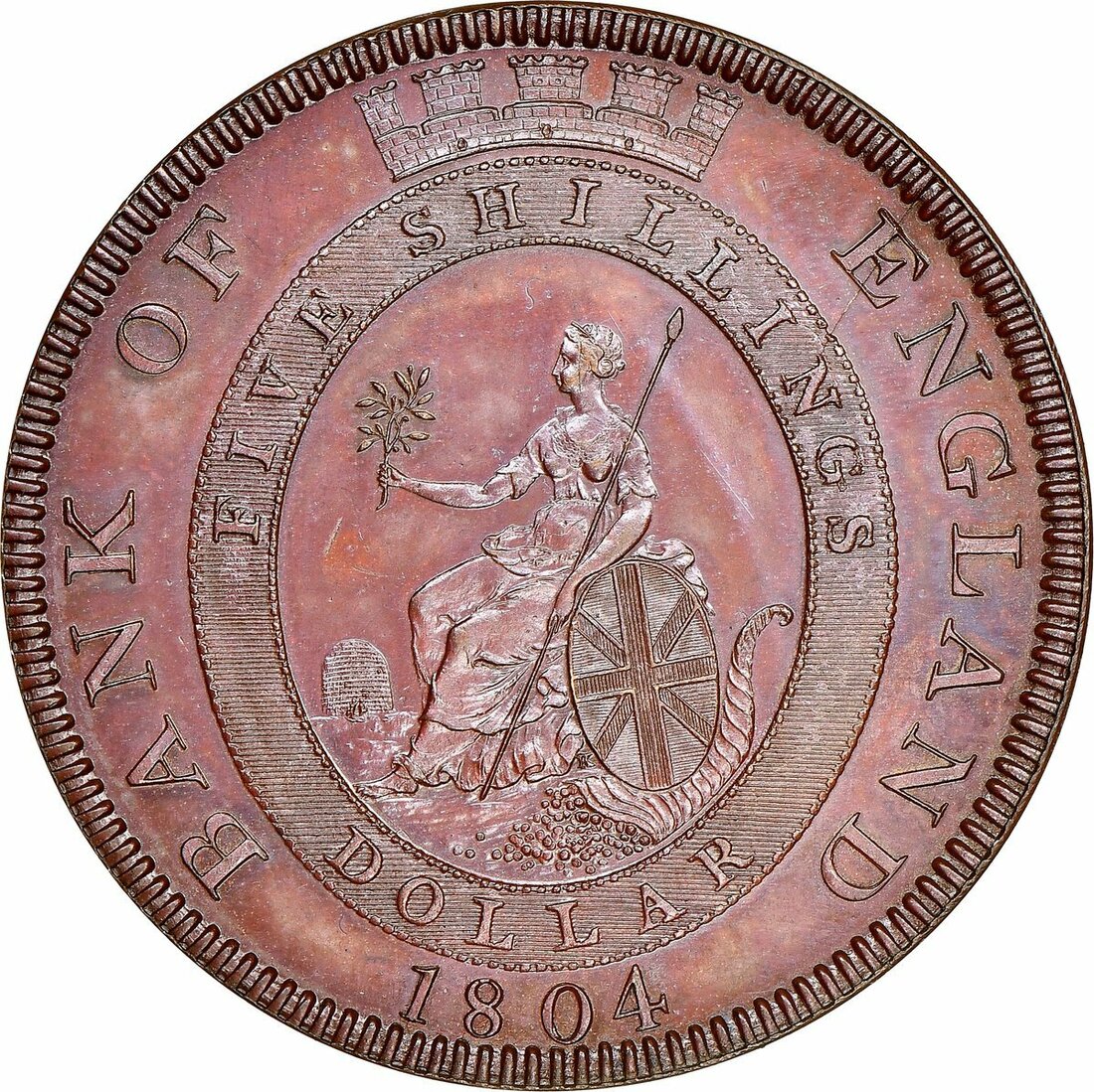 PF62 BN | George III, Bank of England, Pattern Dollar, 1804, in copper, on a thick planchet, laureate, draped and cuirassed bust right, rev. Britannia seated with crowned, oval band, 36.73g, 6h (ESC 1935 [152]), an attractive proof with reddish brown patination, good extremely fine, in NGC holder, graded PF62 BN (Cert. #5878624-002)