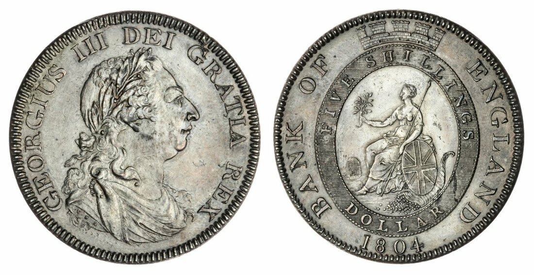 George III, Bank of England, Dollar, 1804, laureate, draped and cuirassed bust right, leaf points to centre of E, no stop after REX, rev. Britannia seated left, upright K to left of shield, edge plain, 26.85g, 12h (Bull E/2; ESC 1951 [164]; Davis 14; Spink 3768), well-struck with only hints of host coin, good extremely fine with much lustre and a fine toning