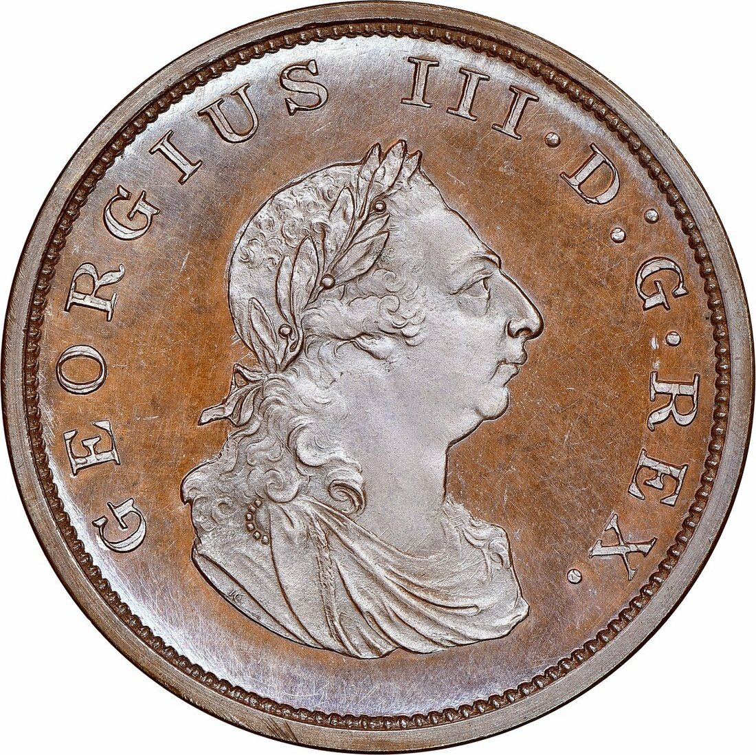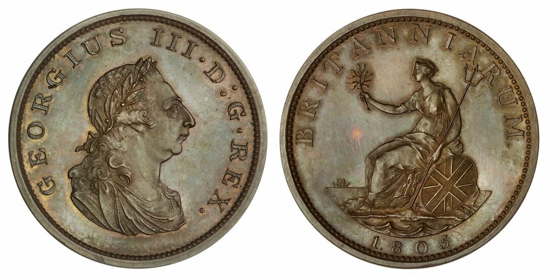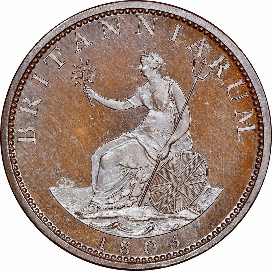 PF65 BN CAMEO | George III, Pattern Penny, 1805, in bronzed copper, by W J Taylor from Soho dies, laureate and draped bust right, K on truncation, rev. Britannia seated left, 18.35g, 6h (Adams 47; Peck 1294), a sumptuous proof with attractive mahogany patination overlying brilliant surfaces, as struck, rare, in NGC holder, graded PF65 BN CAMEO (Cert. #5878624-009) [1 of 1 / 1 Finer]