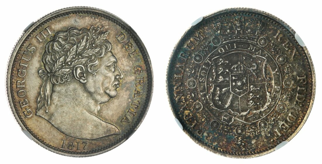 MS62 | George III (1760-1820), Halfcrown, 1817, Type 1, edge milled (Bull 2090; Spink 3788), light peripheral tone, otherwise lustrous, good extremely fine, in NGC holder, graded MS62 (Cert. #6027619-001)