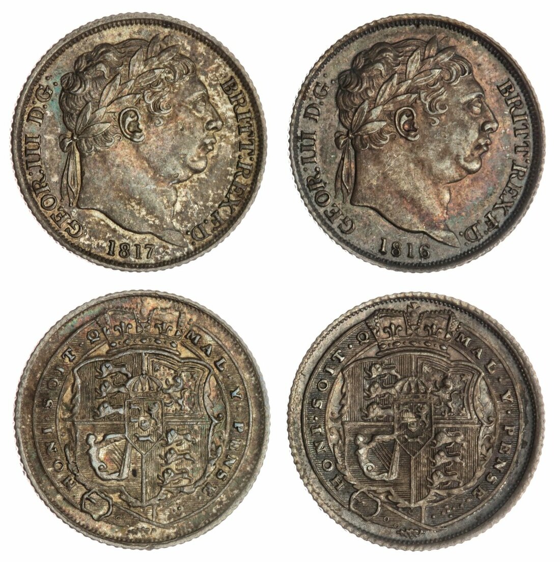George III (1760-1820), New Coinage, Sixpences (2), 1816 (Bull 2191; ESC 1630); another, 1817 (Bull 2195; ESC 1632; Spink 3791), both lustrous, near extremely fine (2)