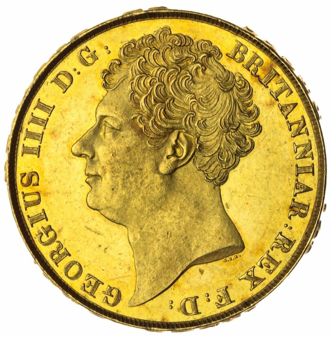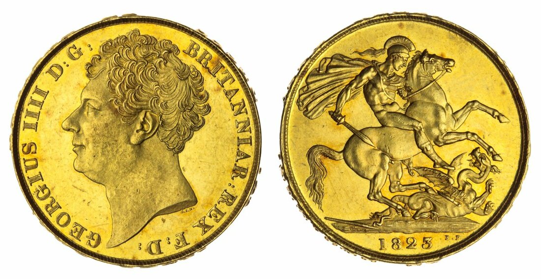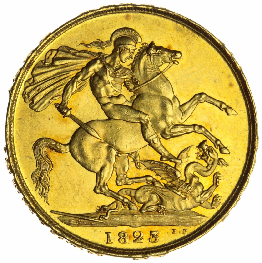 (g) The Spindleberry Collection | George IV (1820-1830), Two-Pounds, 1823 IV, bare head left, rev. St George and Dragon, DECUS ET TUTAMEN ANNO REGNI IV upwards on edge, 16.00g, 7h (Stratos 171; MCE 470; Spink 3798), spots of reddish tone, otherwise quite brilliant, a handsome and pleasing example of this first Currency issue Two-Pounds offered on the eve of its Bicentenary, good extremely fine