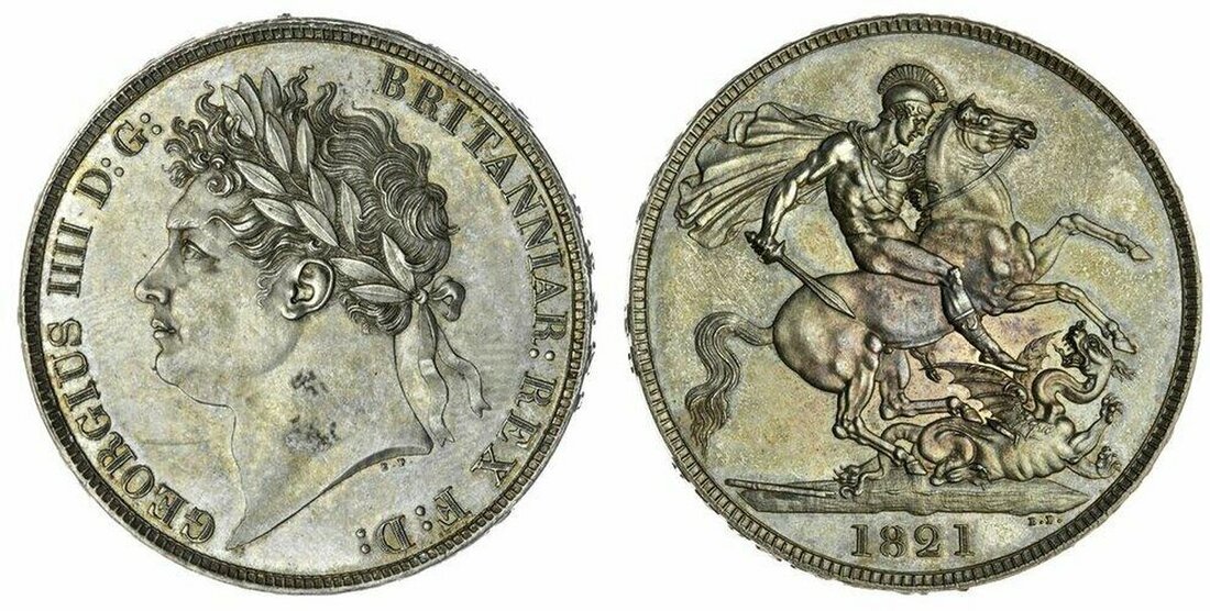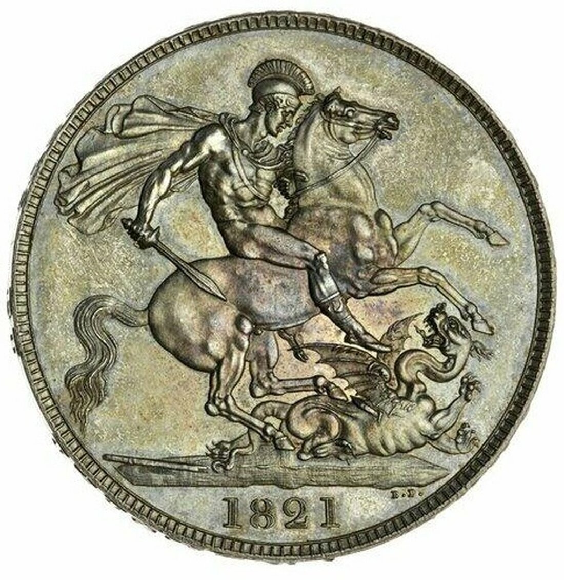 MS62 | George IV (1820-1830), Crown, 1821 SECUNDO, laureate head left, rev. St George and dragon, WWP under broken lance (Bull 2310; ESC 246; Spink 2805), a beautiful example with attractive proof-like bloom, in the cataloguer's view undergraded, in NGC holder, graded MS62 (Cert. #5878622-017)