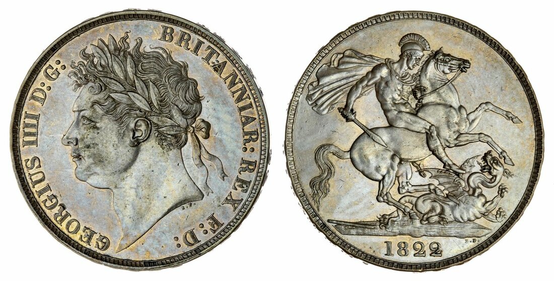 George IV (1820-1830), Crown, 1822 TERTIO, laureate head left, rev. St. George and Dragon, edge lettered downwards, 28.18g, 7h (Bull 2320; ESC 252; Spink 3805), lustrous with hints of playful brilliance to reverse fields and overlying olive-gold toning, extremely fine and increasingly sought after