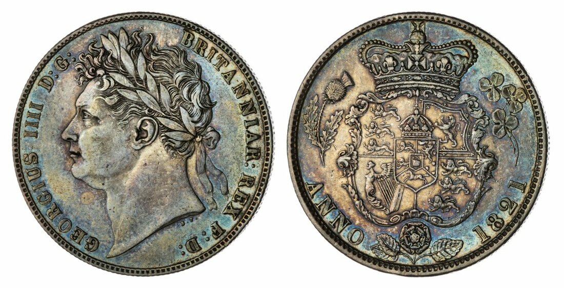 The Abramson Collection of English Coins | George IV (1820-1830), Halfcrown, 1821, Type 1, light garnish, edge milled, 14.10g, 7h (Bull 2360; ESC 631; Spink 3807), a colourful but perhaps unnatural tone, a bolder very fine