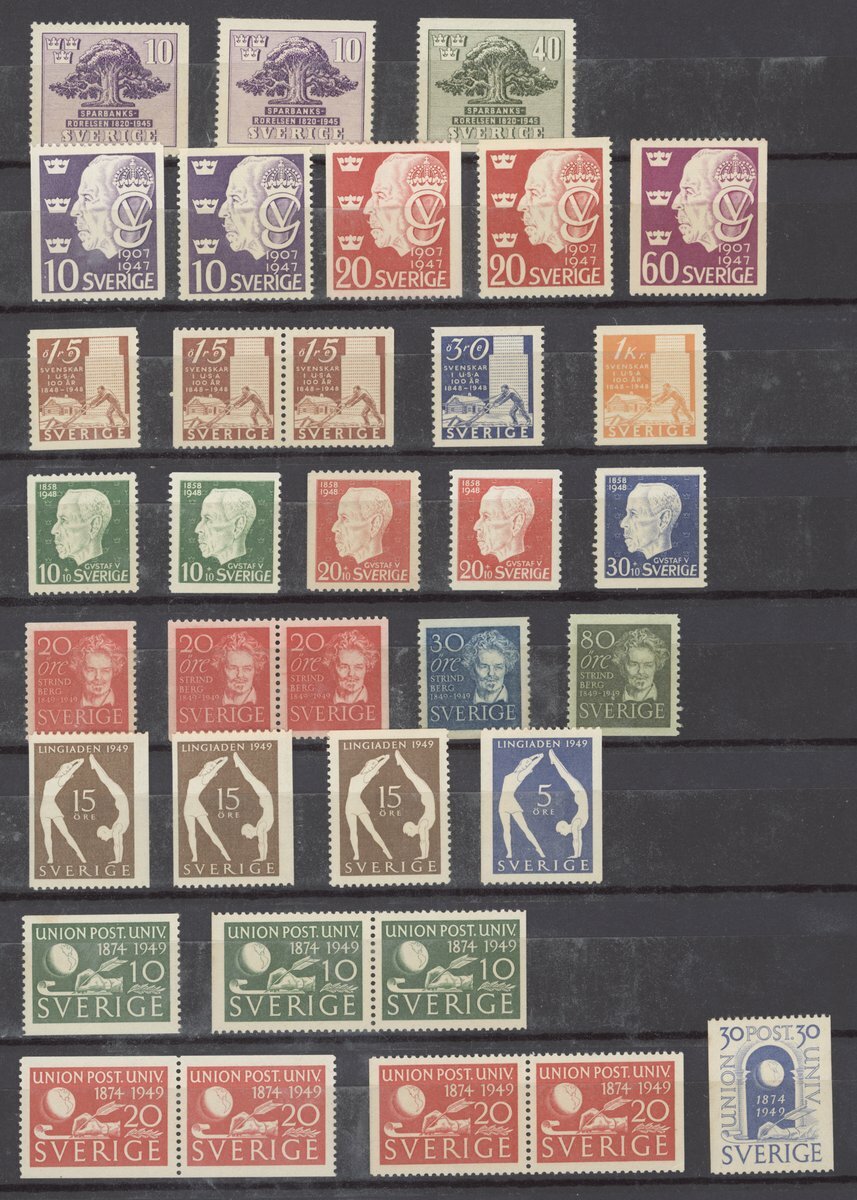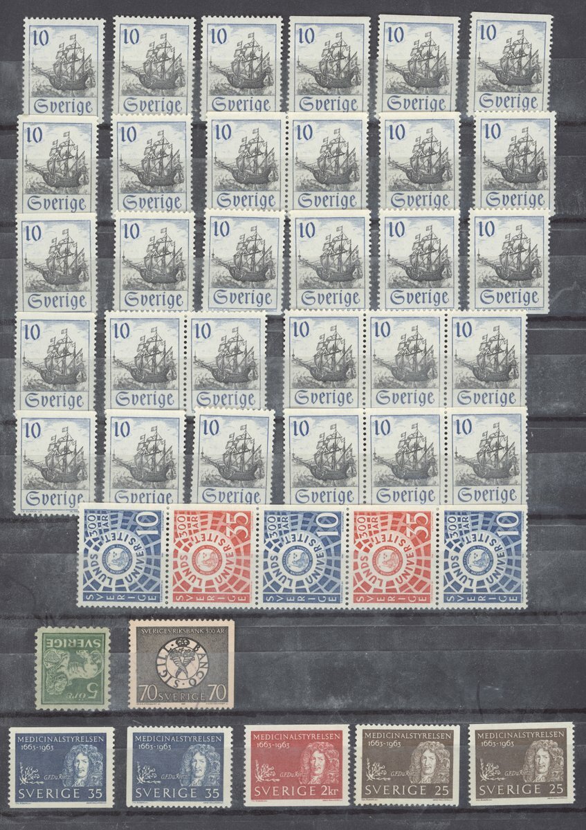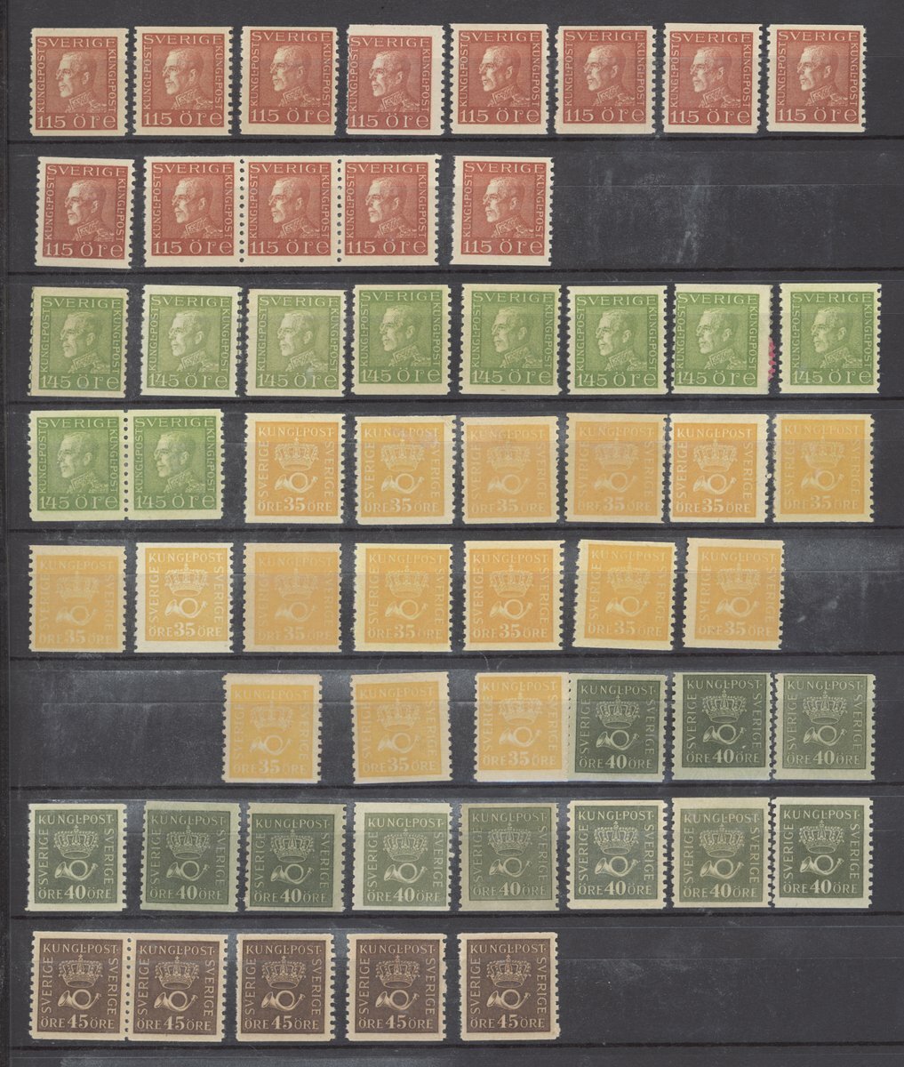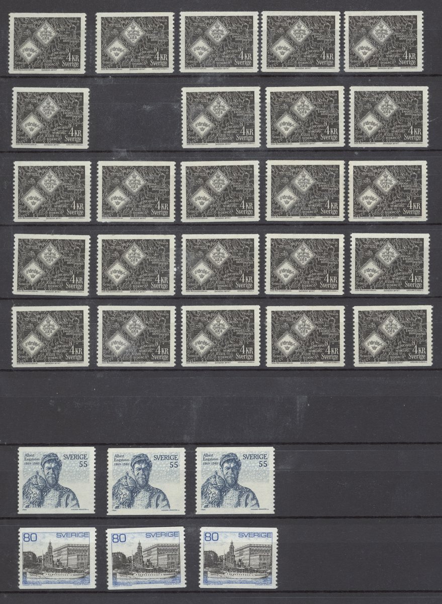 A valuable, duplicated, mostly mint selection housed in twelve stockbooks contained in a carton, including 1891-1911 50ö (5), 1k. (2), 1903 G.P.O. 5k. (8, all gum toned), 1916 Landstorm surcharges, 1920-33 35ö(16), 40ö (11), 60ö bright purple (4), 90ö (8), 120ö black (13), watermark lines 35ö (3), 60ö, 1920 Air set (3), 1921 Vasa (5 sets), 1921-36 15ö perf. 4 sides block of four, 25ö orange (12), 40ö olive-green (6), 50ö grey black (8), 1924 U.P.U. Congress 2k. (6), 5k. (5), Anniversary 2k. (2), 5k., 1927 1k. complete booklet, 1931 5k. (3), 1932 Gustavus Adolphus (10 sets of 5), 1935 Parliament (8), 1936 Tercentenary (8), 1941-58 5k. perf. four sides (block of four), perf. 3 and 4 sides pairs (5), 1952-53 20k. perf. four sides (2 singles, block of four), 1955 Stamp Centenary Set of 5 (11), later issues to 1989 Eagle Owl 30k. (25), etc., mixed condition with some toned or stained but many unmounted mint and fine