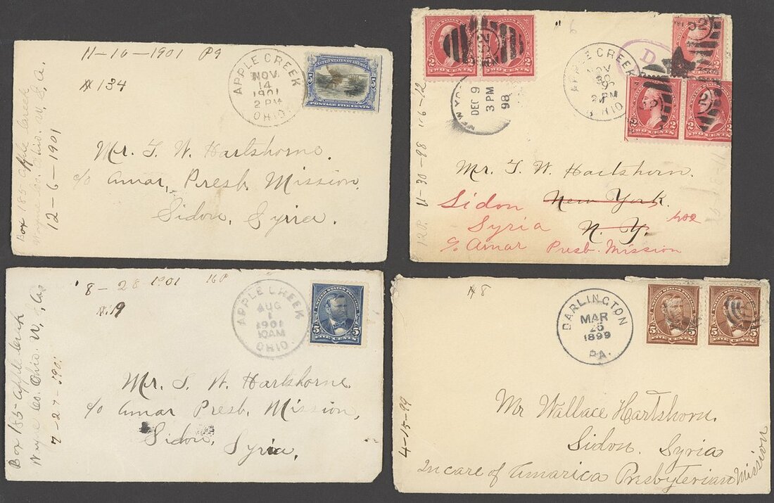 1898-1902 selection of fifty-seven envelopes to the same addressee at the Aman Presbyterian Mission, Sidon, Syria, mostly from Apple Creek or Orrville Ohio, 5c. or 10c. frankings; all with manuscript notes on the front; mixed condition