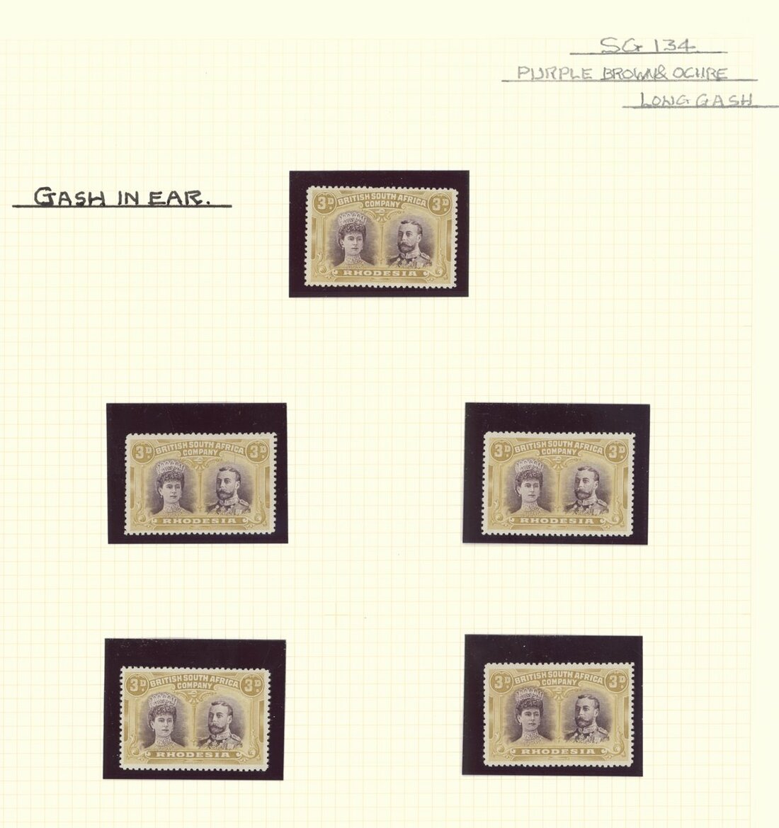 3d. purple and ochre (5) one [2] long gash in Queen's ear, four with part to large part original gum; one regummed and [2] with a light crease though of fine appearance