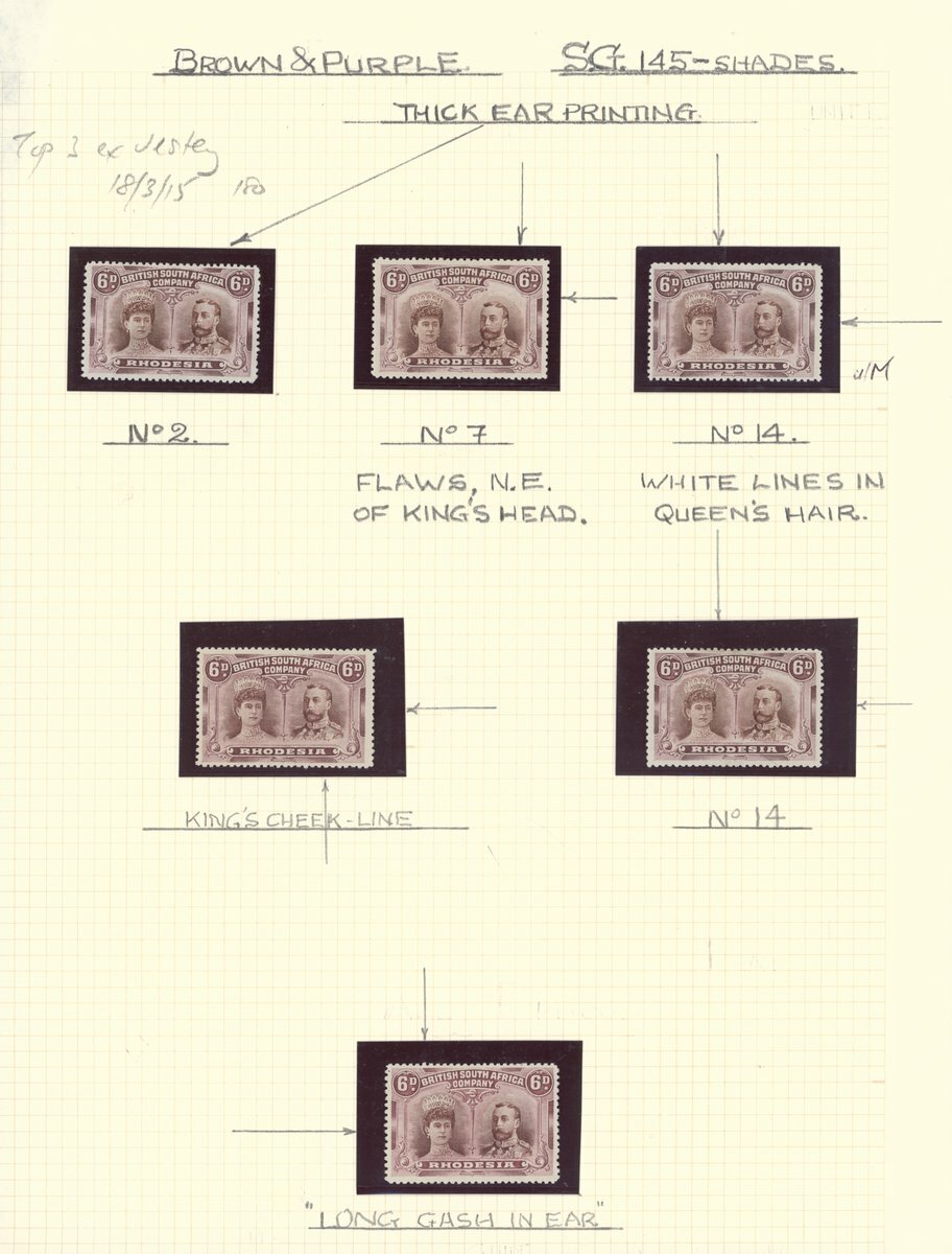 6d. brown and purple (5) comprising [2], [7], [14] (2), and one other described as King's cheek line, and 6d. red-brown and mauve [2] with long gash in ear, good to fine mint with one [14] unmounted