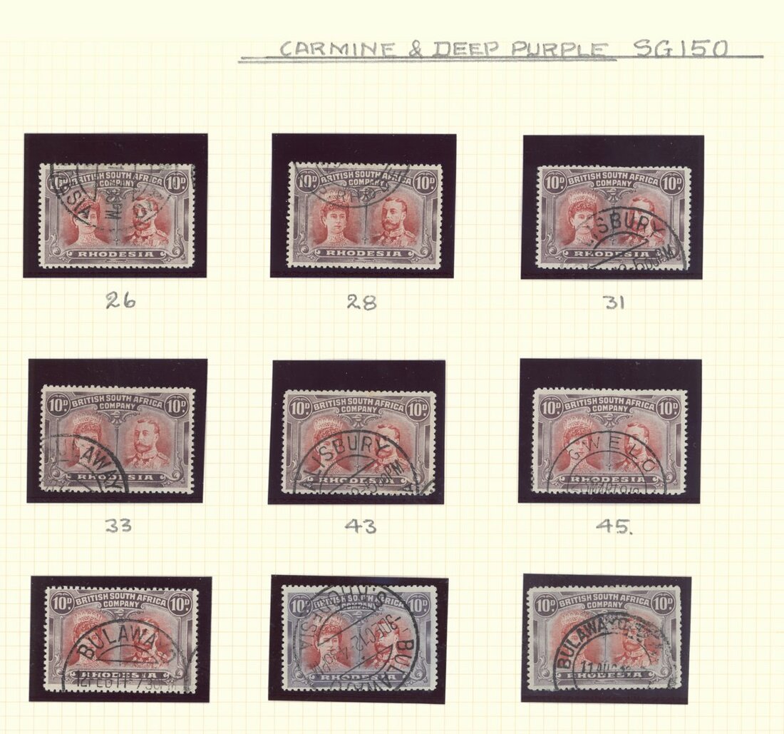 10d. carmine and deep purple, nine examples cancelled-to-order with Bulawayo, Gwelo or Salisbury datestamps; two a little faded, otherwise fine
