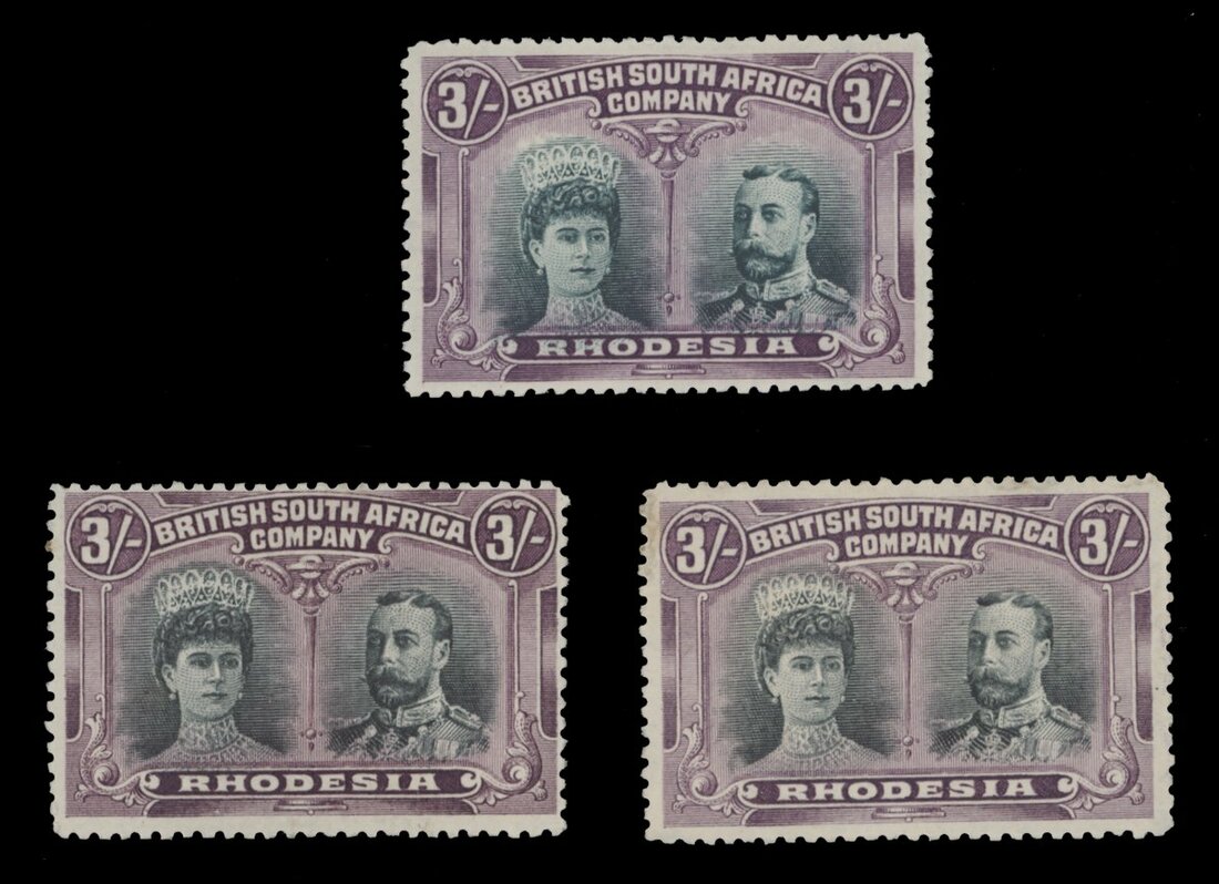 3/- green and violet (two shades, one well centred, trace of soiling in one corner) and deep bluish green and deep purple (ex "Star"), good to fine mint. S.G. 158, RSC "A"
