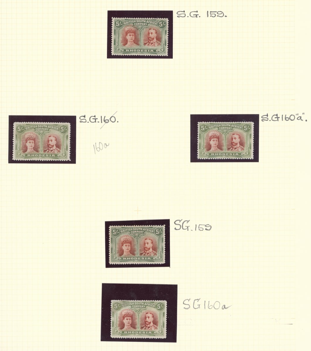 5/- vermilion and deep green (2) and crimson and yellow-green (3), small (one S.G. 160a) to large part original gum, fresh and fine. S.G. 159, 160a, £1,550