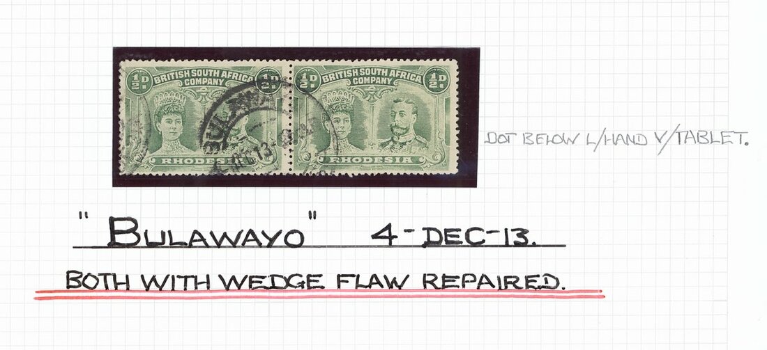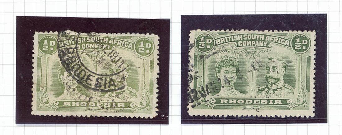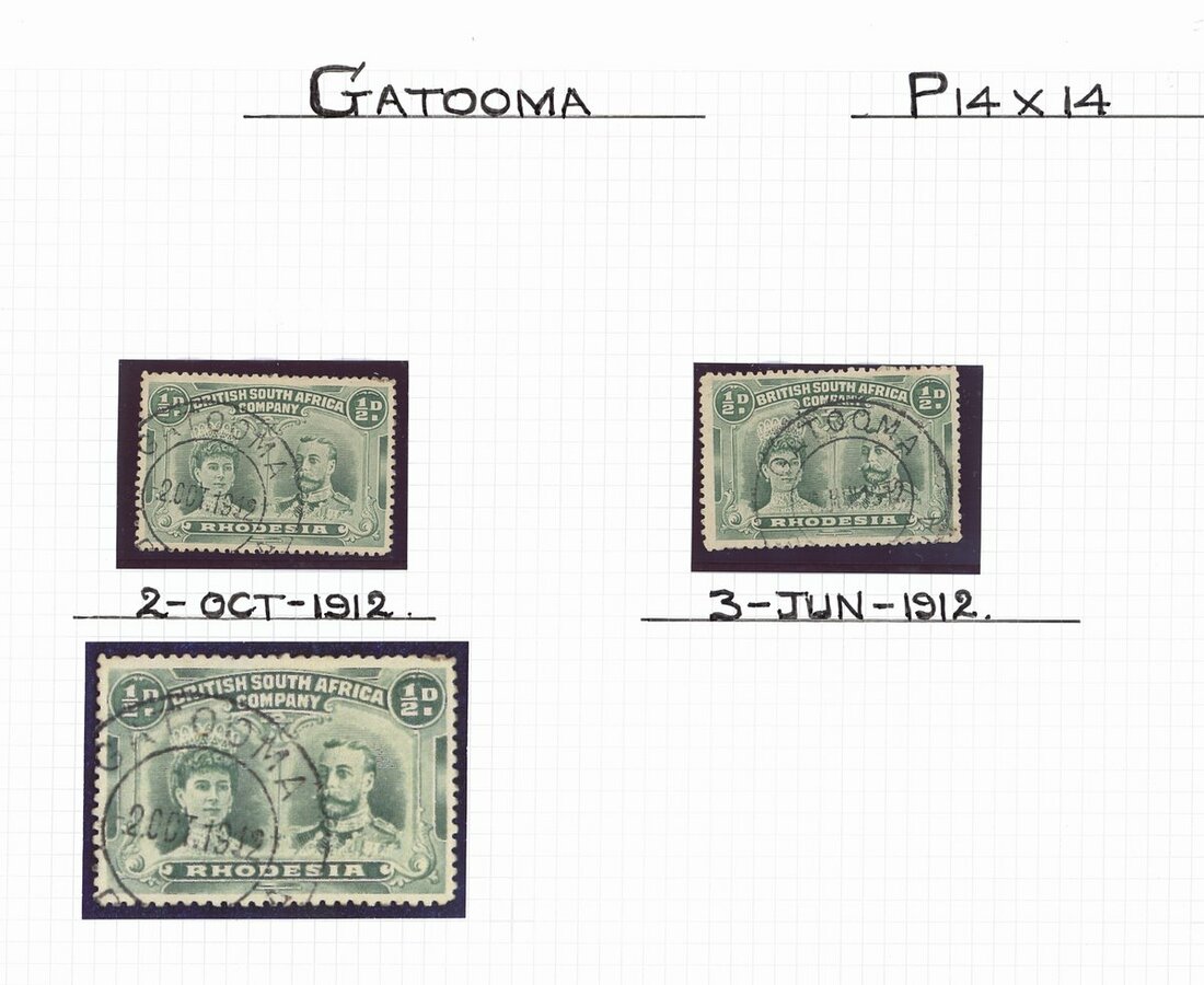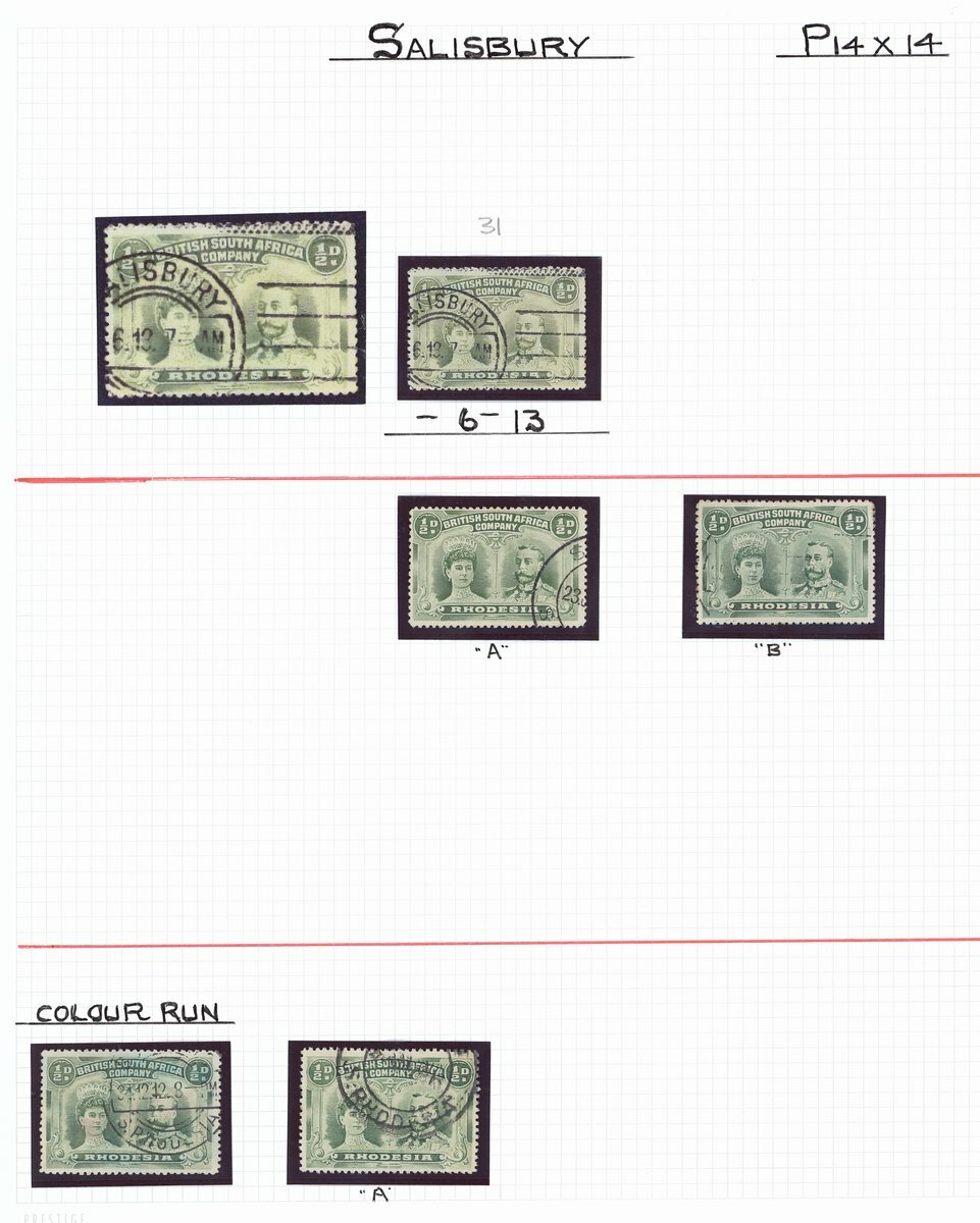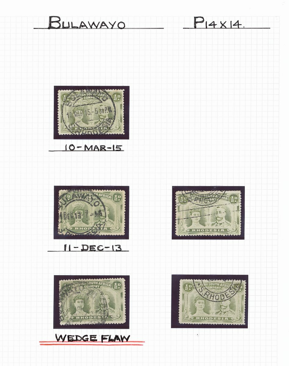 ½d. collection comprising perf. 14 (126 with a few pairs) one with "double dot" variety and six with repaired "wedge" flaw, and perf. 15 (27), two with repaired "wedge" flaw, neatly cancelled by double-ring datestamps and arranged in alphabetical order by post offices (17) from Balla Balla to West Nicholson dated between 1910 (Bulawayo forgery) to 1917. Cat. £900+
