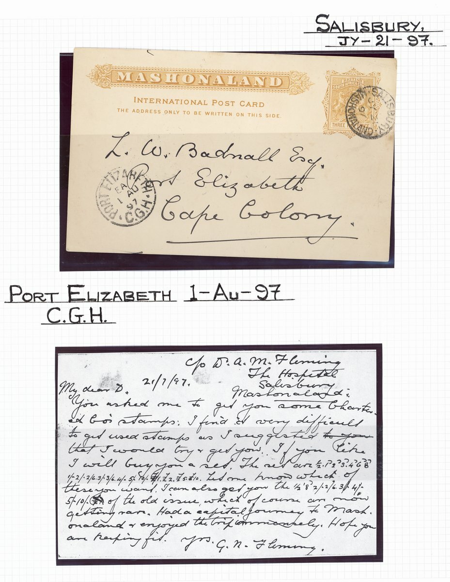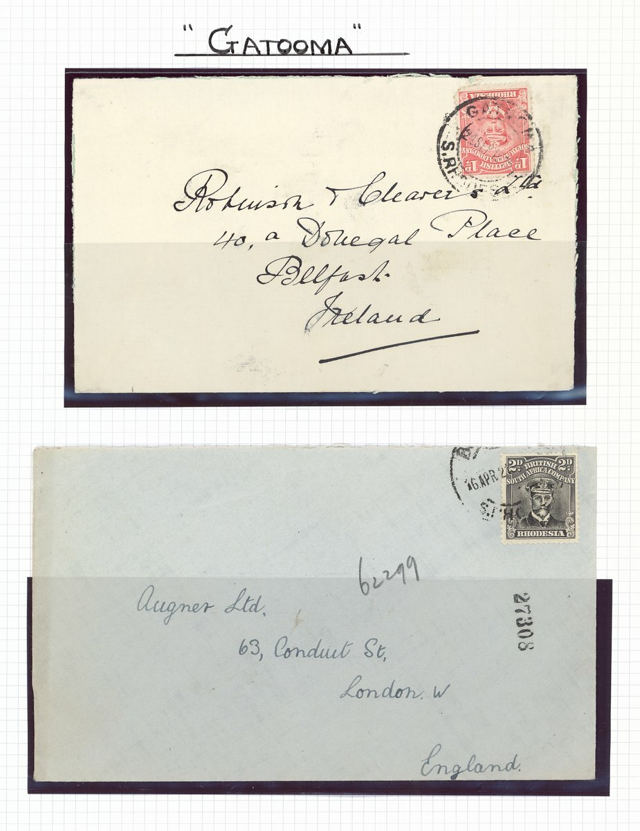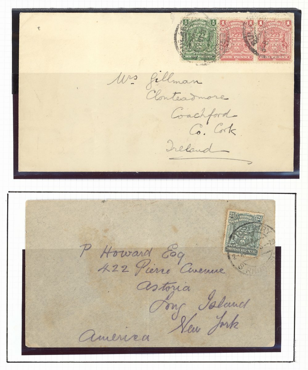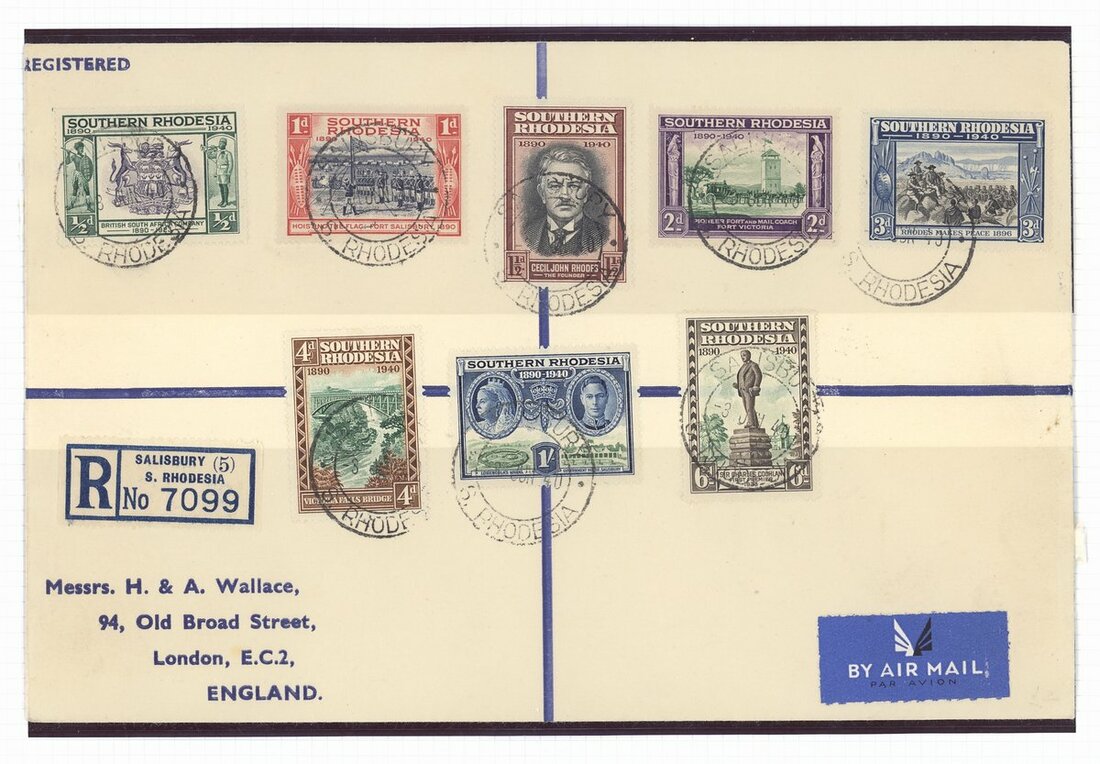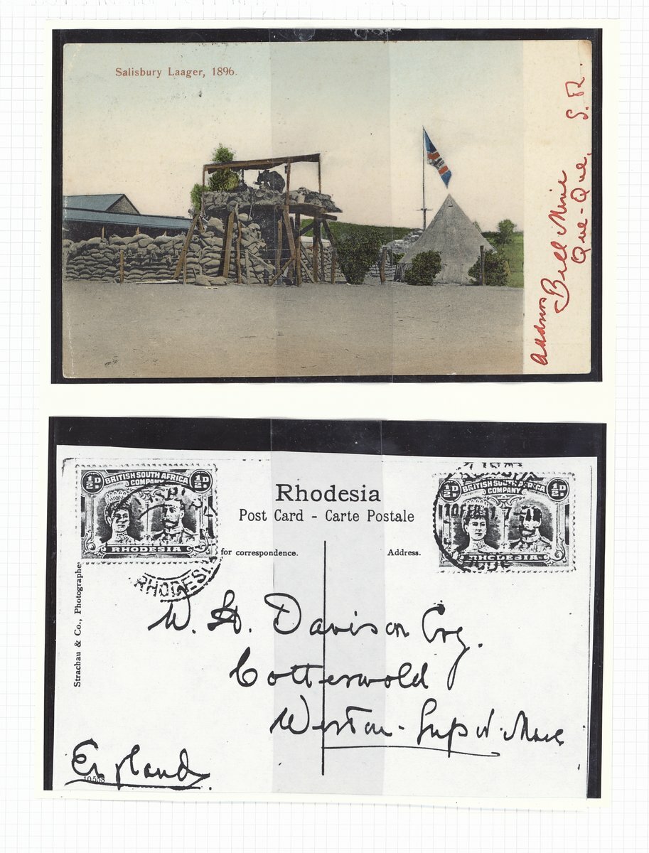 1897 1½d. card from Salisbury to Port Elizabeth, 1898 1½d. card, uprated with ½d., from Salisbury to England, 1898 front from Trieste to Cecil Rhodes at Pretoria and redirected to Cape Town, 1904 envelopes to Ireland and USA franked at 2½d., 1910 1d. card from Salisbury to England, 1911 card from Salisbury to England with Double Head ½d. (2), 1913-21 envelopes to U.K. franked at 1d. (2, one from Livingstone) and 2d., 1926 envelope from Filabusi to England franked at 2d. and 1940 (June) envelope registered from Salisbury to England bearing Rhodes set used on day of issue; also S.A.R. Publicity Dept. unused cards (4)