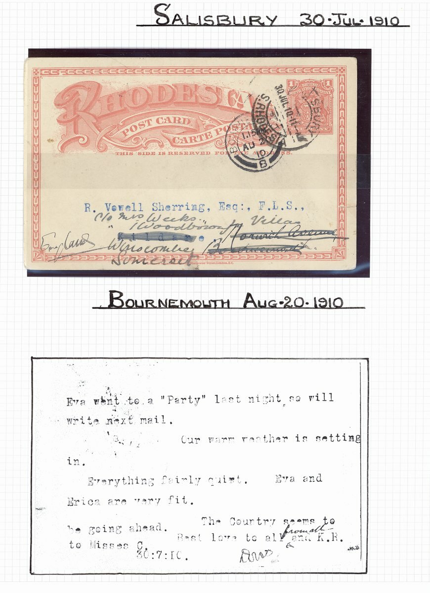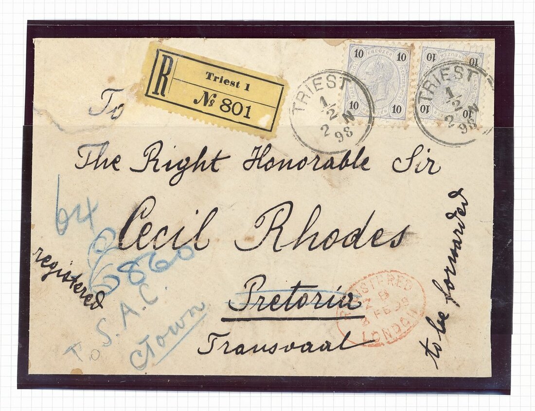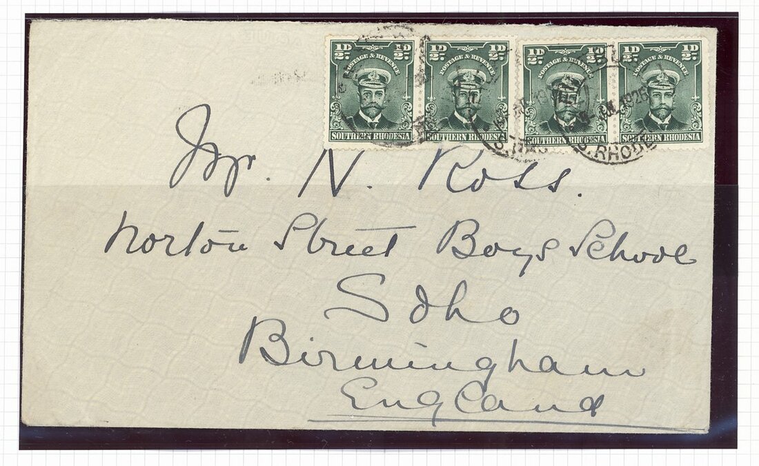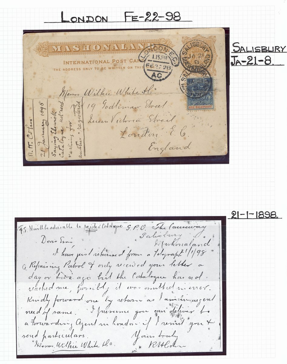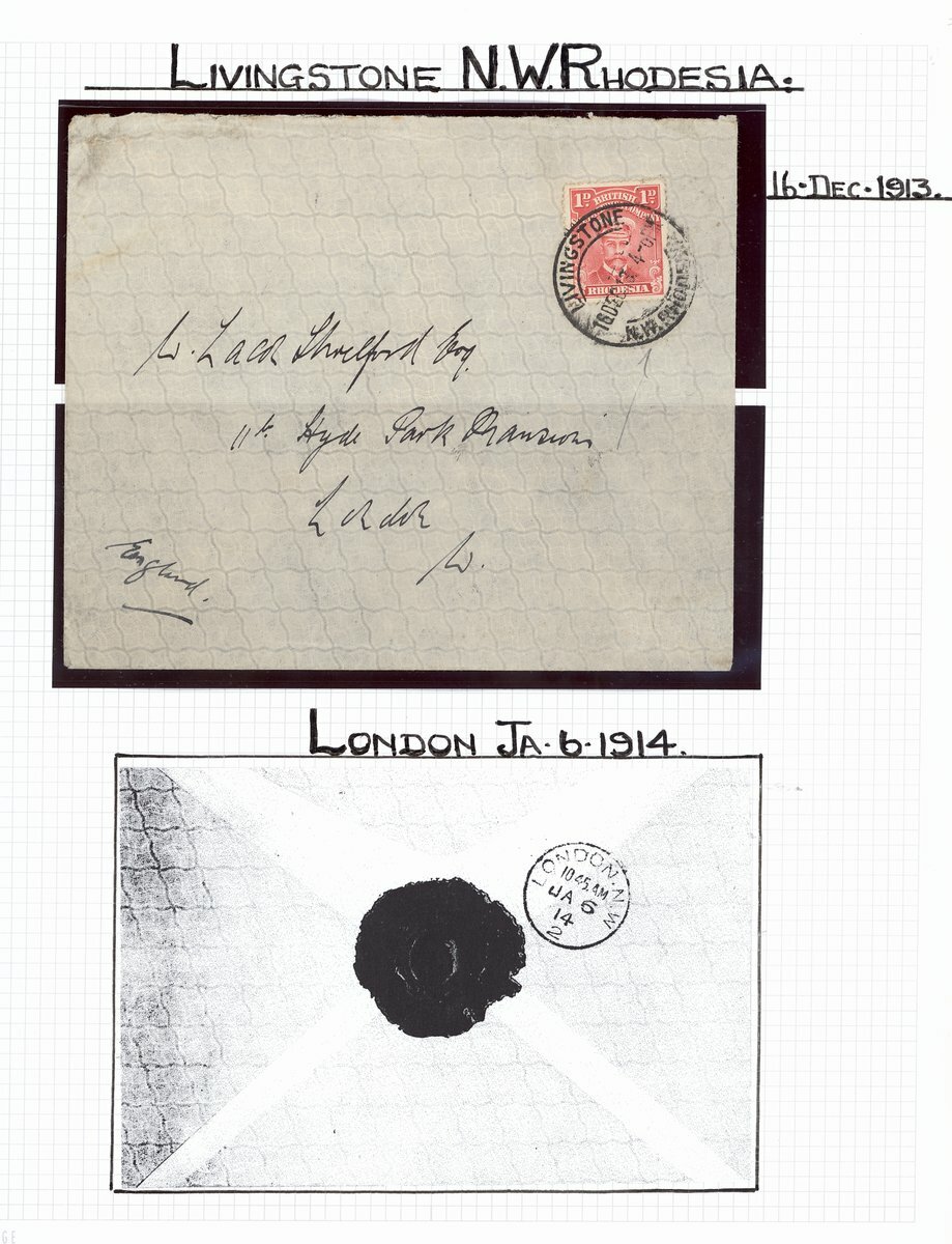 1897 1½d. card from Salisbury to Port Elizabeth, 1898 1½d. card, uprated with ½d., from Salisbury to England, 1898 front from Trieste to Cecil Rhodes at Pretoria and redirected to Cape Town, 1904 envelopes to Ireland and USA franked at 2½d., 1910 1d. card from Salisbury to England, 1911 card from Salisbury to England with Double Head ½d. (2), 1913-21 envelopes to U.K. franked at 1d. (2, one from Livingstone) and 2d., 1926 envelope from Filabusi to England franked at 2d. and 1940 (June) envelope registered from Salisbury to England bearing Rhodes set used on day of issue; also S.A.R. Publicity Dept. unused cards (4)