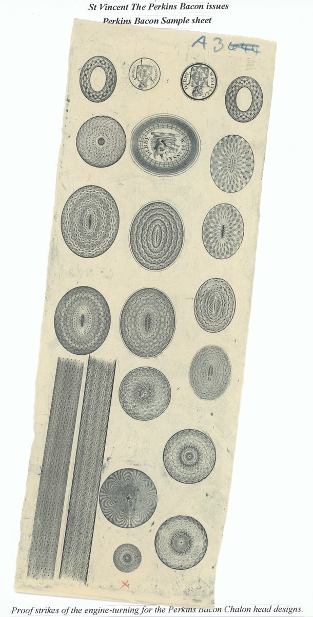 1883 a piece of wove paper (90x255mm) bearing twenty one engine-turned designs, most are in an oval format with circular and continuous; the sheet originally numbered "444" has been changed to "A3" in blue crayon. Includes three designs for W.Evans & Co, Derby. A good sheet