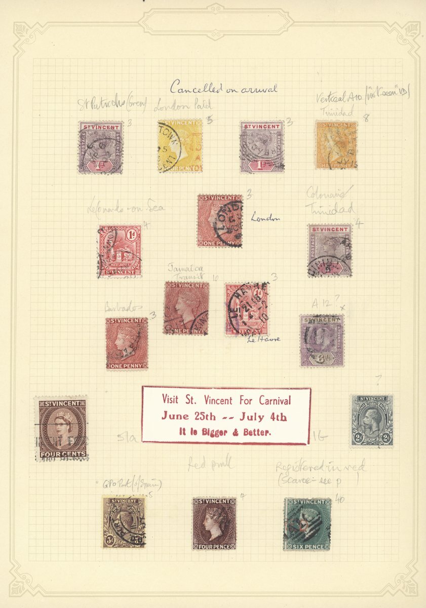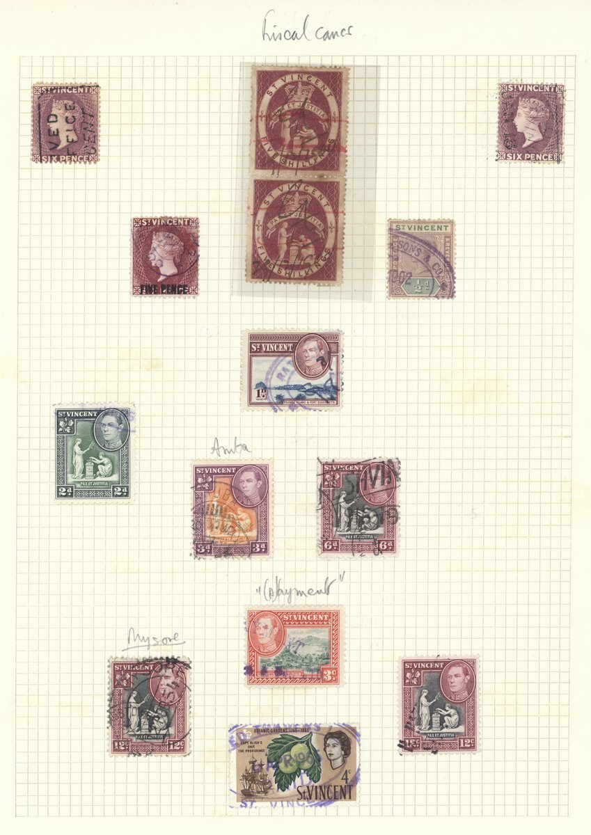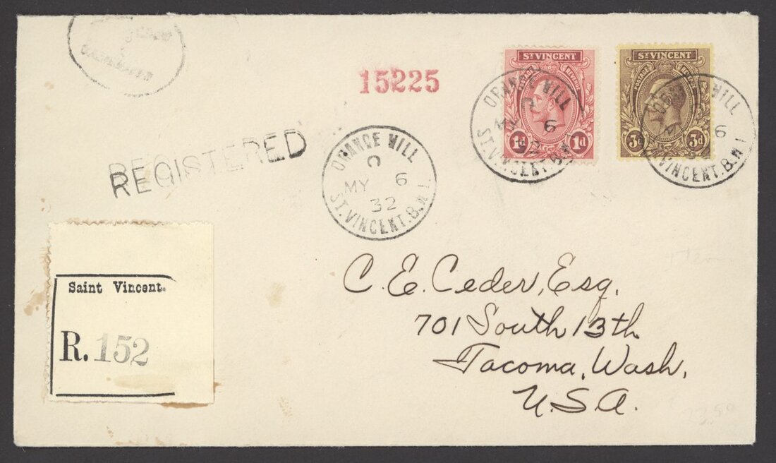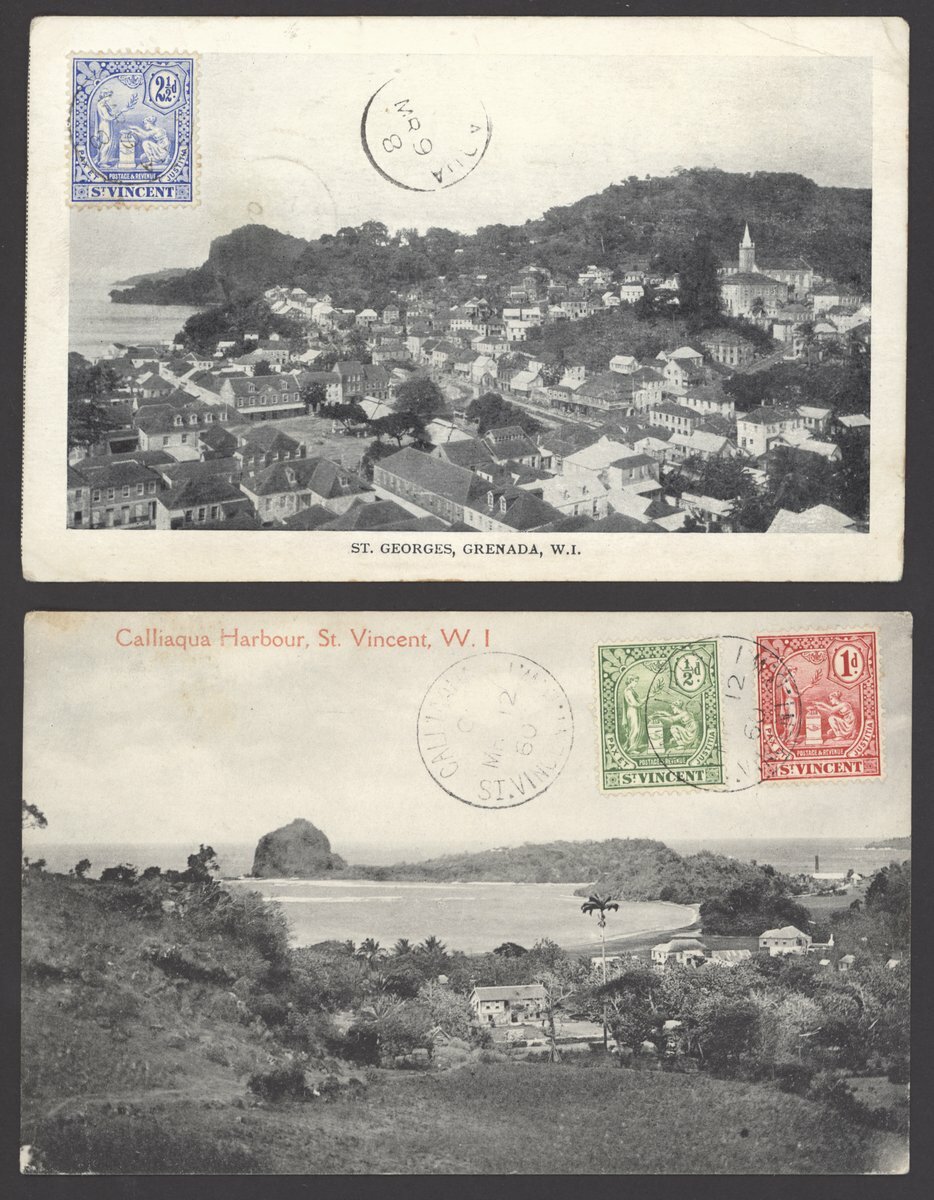A group of cancellations which includes "A10", Anglo-French Accountancy handstamp, St. Vincent stamps cancelled on arrival at destination and fiscal cancellations; also 1908 picture postcard of St. Georges, Grenada bearing 2d. cancelled by the small Calliaqua c.d.s.; 1909 (12 Mar.) picture postcard of Calliaqua Harbour with 1½d. franking tied by the large Calliaqua c.d.s. (a very early date) with the year date inverted; 1932 envelope registered to Washington bearing 4d. franking tied by Orange Hill c.d.s.