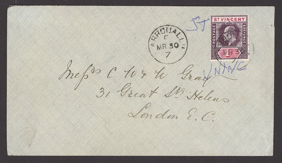 Barrouallie: 1907 (30 Mar.) envelope to London bearing K.E.VII 1d. tied by a fair strike of the code "C" c.d.s. with a fine strike alongside; the reverse with Kingstown and London arrival (15.4) c.d.s. Note that the "0" is missing from the year slug.