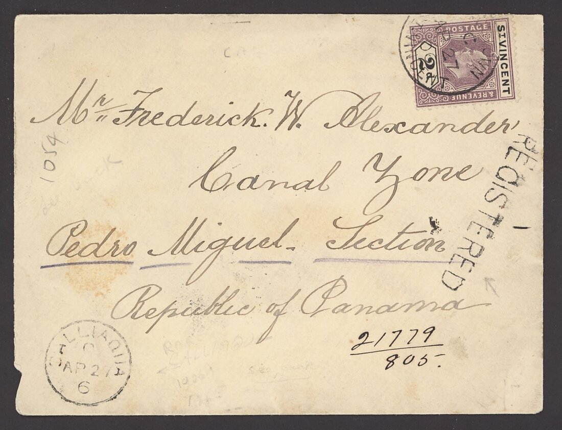 Calliaqua: 1906 (27 Apr.) envelope registered to Panama bearing K.E.VII 4½d. franking, the address side with 2d. tied by Kingstown c.d.s. with the 19.25mm Calliaqua c.d.s. with the code letter "C" facing downward and with a fine strike of straight-line "