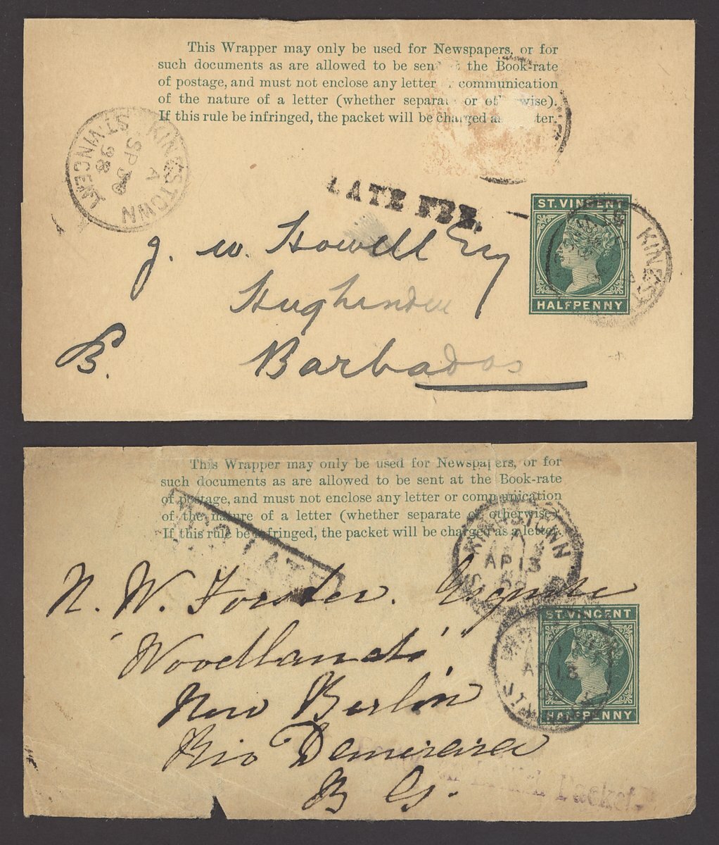1898 (30 Sept.) ½d. postal stationery newspaper wrapper to Barbados cancelled by Kingstown c.d.s. and with a very good strike of the small "