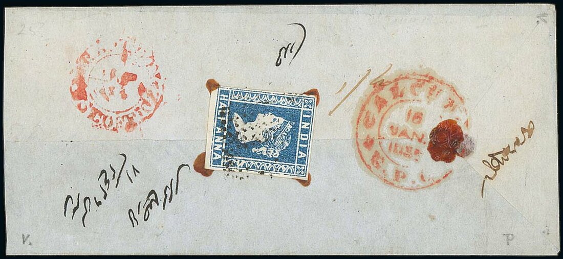 1855 (16 Jan.) entire from Rangoon to Calcutta, pre-paid under the government mail contract rate up to ¼ tola, franked with 1854 ½a. blue (Die II) and tied by diamond of dots,