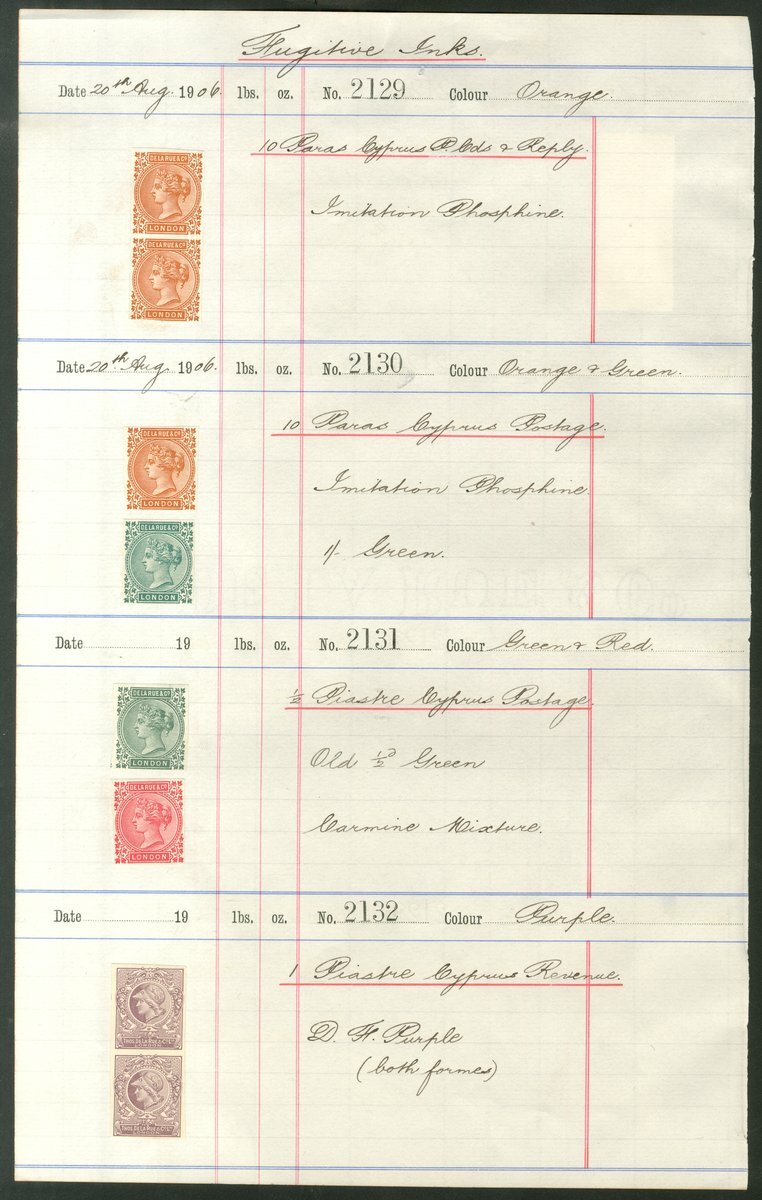 1906 (20 Aug.) complete page from the De La Rue Ink Recipe Book for Cyprus with ink recipes for 10 Paras Postal Cards & Reply ('Imitation Phosphine'), KEVII 10 Paras Postage plus 1 Piastre Revenue ('D.F. Purple') with DLR dummy stamps affixed as colour standards. The reverse bears dummy stamps and March 1907 recipe (AA4) for 'English Unappropriated Stamps overprinted with above ink' noted 2/-, 3/- and 4/- Foreign Bill/Contract Notes. An important and unique historical document from the De La Rue archives