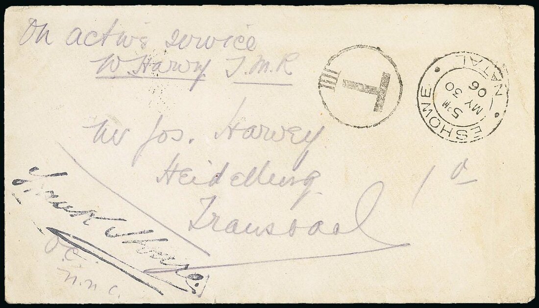 1906 (30 May) envelope to the Transvaal, headed "On Active Service, W. Harvey T.M.R." (Transvaal Mounted Rifles), countersigned "Frank Hoare, O.C. N.N.C." (Natal Naval Corps) at lower left, showing