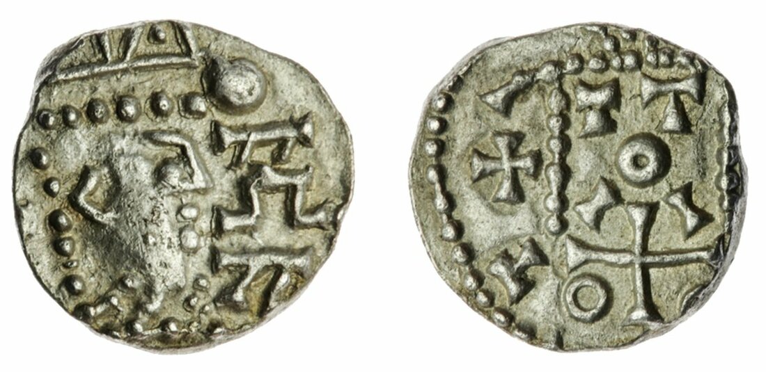 Anglo-Saxon England, Primary Series (680-710), Sceat, Series CZ, large bead before radiate bust right, runes before, row of pellets behind, rev. degenerate, beaded, votive standard without lower row of pellets, cross pattée to sides, lower cross is large with annulet either side, tufa above, horns lowered, Ts to lower corners, 1.20g, 0° (SL 5-10, plate coin; SCBI 69, 96 this coin; Abramson, 2012a, Fig 20; Abramson, 2012b, Fig 17d; Spink 779A plate coin), of bright silver, sharply struck in a touch off-centre, nevertheless near extremely fine, rare thus