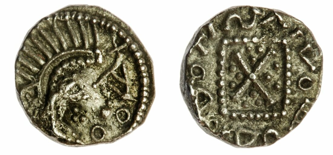 Anglo-Saxon England, Primary Series (680-710), Sceat, Saroaldo, type 11, disintegrated bust right with diadem low on forehead, cross above eye in upper angle of nose, pellet lips, crescent ear, ladder collar, two annulets before, rev. cross pommée in beaded diamond with trefoil of pellets in each quadrant, initial cross and legend, 1.13g (SL 7-40; SCBI 69, 142 this coin; Metcalf [2016], 55; T&S pp. 147-51, 151-4; Gannon 49, 128, 172, no. 114, 174, 177, no. 142 and 143, 184 no. 22, 185, and Fig. 4.31; North 44; Spink 784), cleaned and lightly porous, otherwise a bolder very fine, scarce