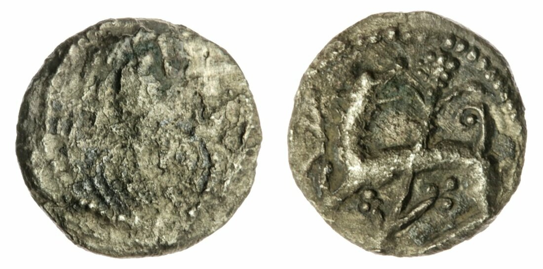 Anglo-Saxon England, Secondary Series (710-760), Sceat, Series K, type 42, variety a [?], diademed, draped bust right, knotted wreath knot behind, before a bird of prey on shoulder, looking right, rev. animal left, looking back and upwards, tail raised, rounding angled bush with buds and berries, clawed feet, 0.89g, 270° (SL 41-10; SCBI 69, 434 this coin; Abramson, 2012b, Fig 2c; MEC 8 Series Kc; North 101; Spink 803A), corroded and waterworn, with spots of verdigris, otherwise toned, about fine / very fine, scarce