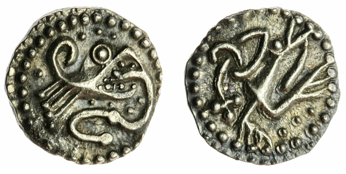 Anglo-Saxon England, Secondary Series (710-760), Sceat, Fledgling, style b, wolf head right, prominent mane behind, round eye, pointed ear above, serpent (?) curling below, serrated border, abstract style, rev. eagle running right, large claws below, carrying fish in mouth, trefoil tail in triquetra above, beaded border, double at top, style abstract, 1.15g, 90° (SL 44-20 plate coin; SCBI 69, 455 this coin; Spink 832 plate coin), lightly toned with very faint porosity, otherwise most handsome and attractive, almost extremely fine and extremely rare