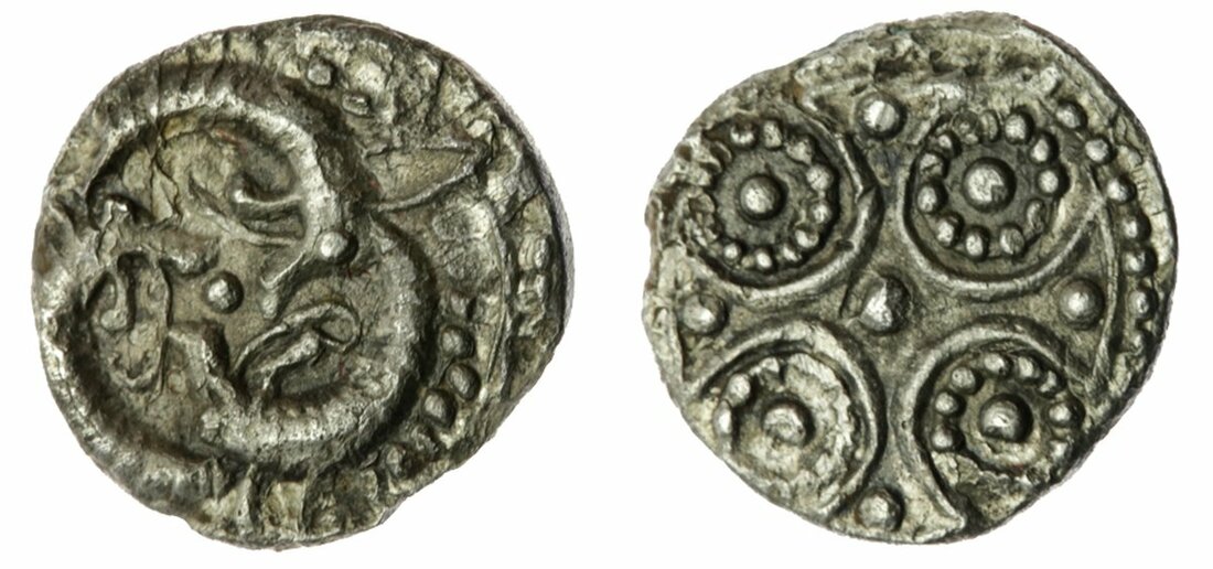Anglo-Saxon England, Secondary Series (710-760), Sceat, Series H, 'Celtic cross', type 48, clockwise whorl of three serpents, with gaping jaws, erect ears and wasp-like bodies, extended linear tongues, central pellet, rev. void Celtic cross, enclosing pellet cross and curving around rosettes in angles, beaded border, 0.91g (SL 47-10; SCBI 69, 357 this coin; T&S pp. 333-40, 289-92; Gannon 174, 180, Fig. 5.5; Spink 801B plate coin), somewhat porous and waterworn, otherwise a bolder very fine, scarce