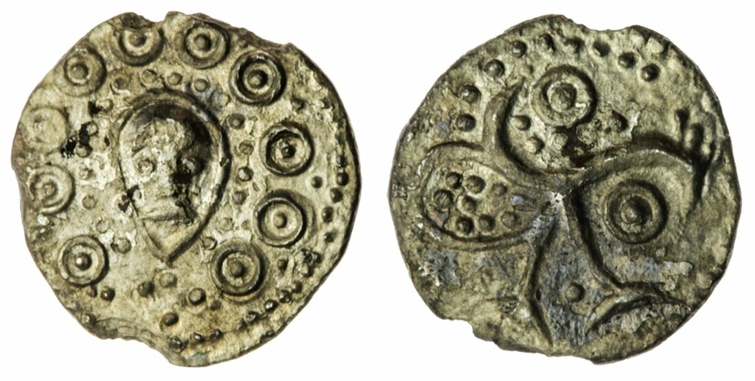 Anglo-Saxon England, Secondary Series (710-760), Sceat, Series H, type 49, Hamwic, central face in beaded circle, ten roundels, rev. roundels above and before, pellets in field, 0.80g, 315° (SL 48-1020; SCBI 69, 377 this coin; North 108, Spink 801A), slightly chipped edge otherwise largely centred, of better fabric than next, a bolder very fine, extremely rare