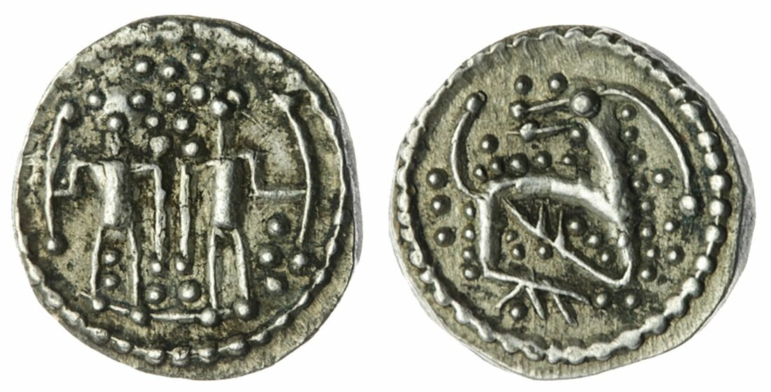 Anglo-Saxon England, Secondary Series (710-760), Sceat, Series N, quincunx between two standing figures, wearing long pleated tunics (?), pellet to outer thighs, cross pommée either side, rev. monster in flight right, looking back, erect tail with pellet end, long crest behind, prominent member, pellet outline, 0.87g, 90° (SL 52-35; SCBI 69, 571 this coin; North 99; Spink 806), trace porosity, otherwise beautifully centred, almost extremely fine, extremely rare