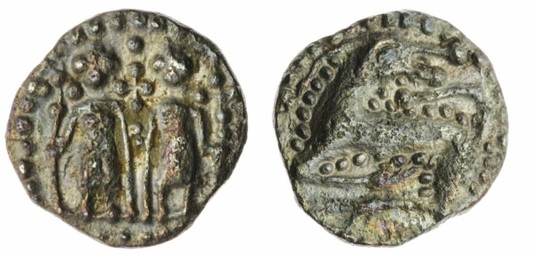 Anglo-Saxon England, Secondary Series (710-760), Sceat, Series N, type 41b, two figures forward, female left, both wearing long tunics, long cross pommée between and at either side, standing on groundline, rev. monster left with large eye, looking back, tail raised behind, pellet outline, 1.10g, 270° (SL 52-40; SCBI 69, 574 this coin; North 99; Spink 806), faint traces of porosity, otherwise lightly toned and largely centred, good very fine