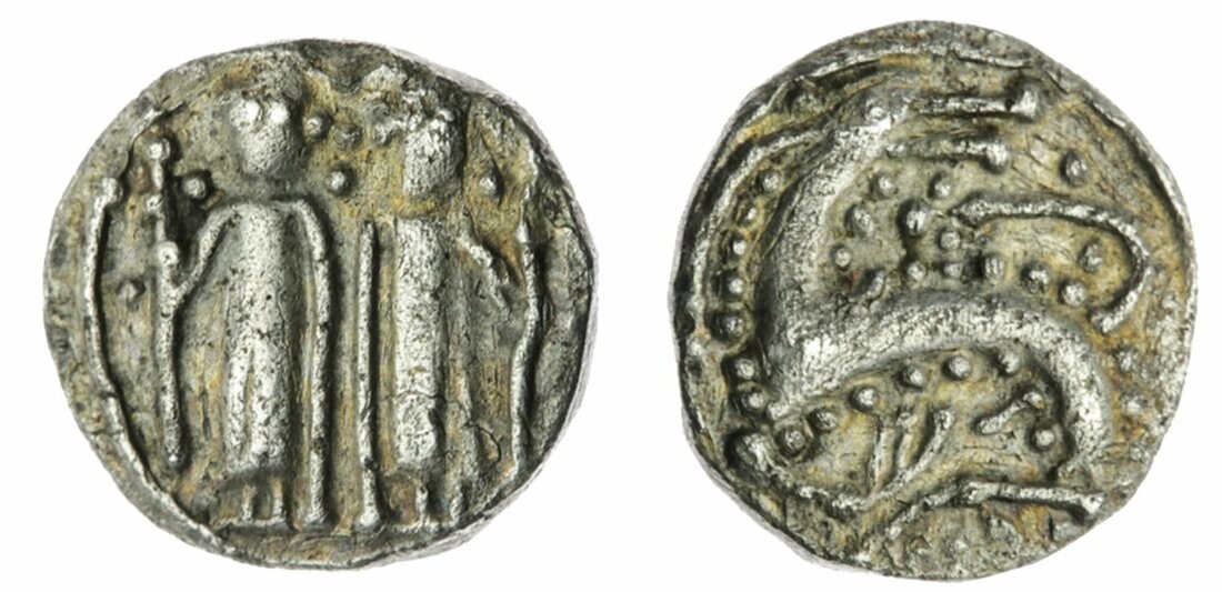 Anglo-Saxon England, Secondary Series (710-760), Sceat, Series N, type 41b, two figures forward, wearing long plain cloaks, long cross pommée at either side, groundline, crescent boat or linear border, rev. monster left, looking back, trefoil tail raised behind, long crest left, prominent member, pellet outline, 1.11g, 90° (SL 52-40, plate coin; SCBI 69, 576 this coin; Abramson, 2012b, Fig 20b; Beowulf 70 this coin; North 99; Spink 806), largely centred and of good fabric, lightly toned, a pleasing very fine