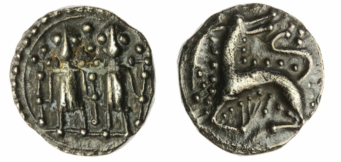 Anglo-Saxon England, Secondary Series (710-760), Sceat, Series N, type 41b variety, two figures forward, wearing short, pleated tunics, cross pommée between and either side, pellets on shaft of cross, groundline, rev. monster left, looking back, S-shaped tail raised behind, crest left, prominent member, pellets in field, 1.04g, 0° (SL 52-40, plate coin; SCBI 69, 578 this coin; MEC 8 Series Nb; North 99; Spink 806 plate coin), rich dark patina and the devices in high relief, largely centred and appealing but for a central stain, otherwise good very fine and scarce